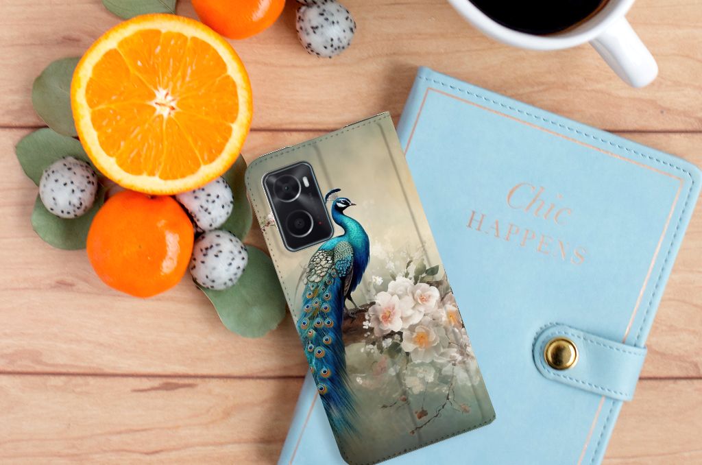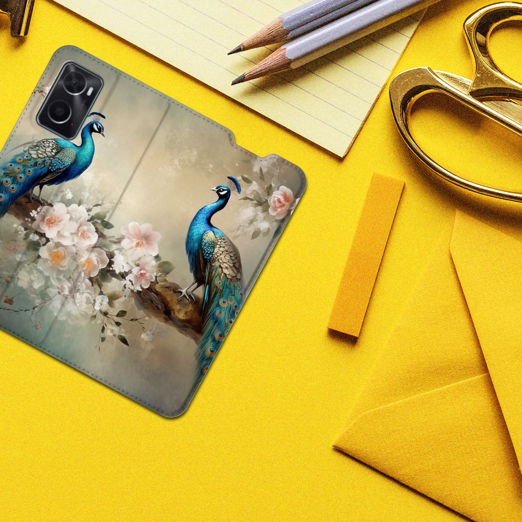 OPPO A76 | A96 Telefoonhoesje met Pasjes Pauw met Bloemen