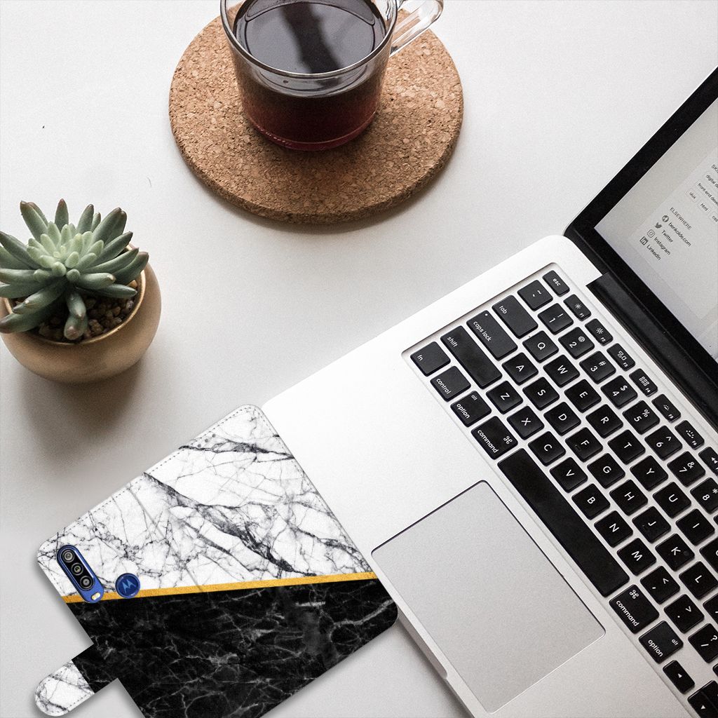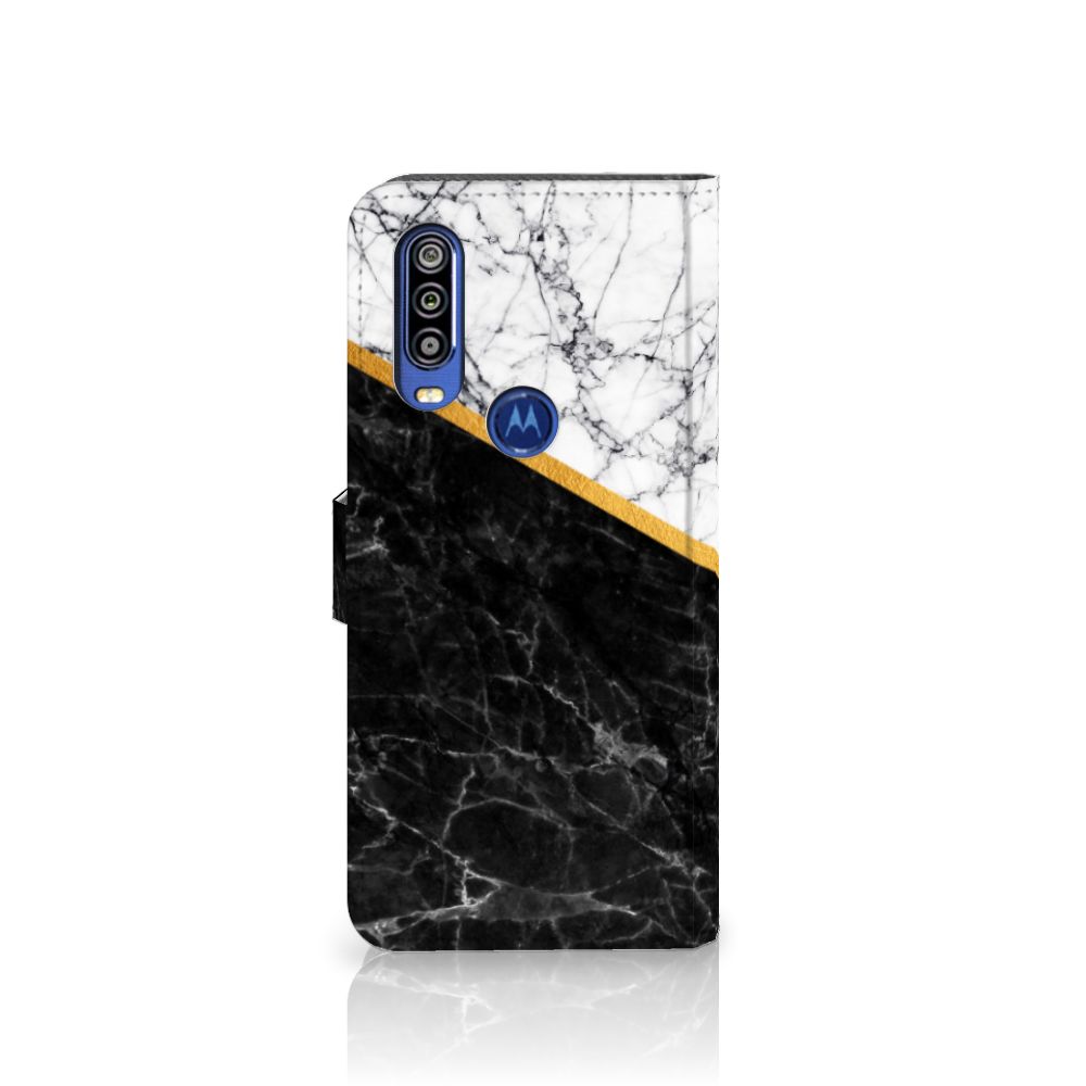 Motorola One Action Bookcase Marmer Wit Zwart - Origineel Cadeau Man