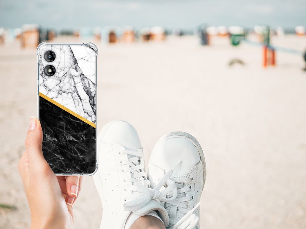 Motorola Moto E13 Anti-Shock Hoesje Marmer Wit Zwart - Origineel Cadeau Man