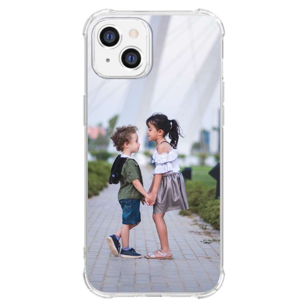 Anti-Shock Back Cover Hoesje Maken Apple iPhone 14. Ben je op zoek naar een originele en unieke bescherming voor je telefoon? Dan ben je bij B2C Telecom aan het juiste adres! Je kunt via onze website gemakkelijk een telefoonhoesje ontwerpen met foto's, tekst of bedrijfslogo. De mogelijkheden zijn eindeloos. Wees creatief en upload foto's of plaatjes van je kinderen, huisdieren, familie, hobby of favoriete voetbalclub. De foto's of plaatjes kun je in de gewenste grootte plaatsen of draaien voor een speels effect. Maak het hoesje persoonlijker door je naam of quote toe te voegen. Je kunt kiezen uit verschillende lettertypes; van strak tot vetgedrukt of ga je liever voor iets sierlijks? Het kan allemaal! De kers op de taart is natuurlijk de toevoeging van een glossy-effect! Kies uit verschillende effecten en jouw hoesje wordt subtiel bedrukt met een glossy-effect. Kortom, wij bieden verschillende mogelijkheden om jouw hoesje zo persoonlijk en uniek mogelijk te maken! Jouw ontwerp wordt bedrukt op TPU hoesje. Enkel de voorzijde van het hoesje worden bedrukt. De randen blijven transparant. Overtuigd? Ontwerp dan vandaag nog je eigen telefoonhoesje en ontvang jouw ontwerp binnen een aantal werkdagen in huis!