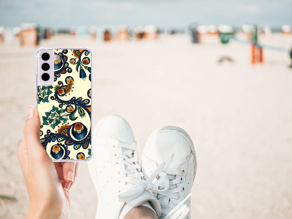 Ben je op zoek naar een uniek telefoonhoesje voor je Samsung Galaxy S22? Dan ben je bij B2C Telecom aan het juiste adres! Speciaal voor jou hebben we dit prachtige Barok Flower design in onze collectie hoesjes opgenomen. Het design wordt bedrukt op een Anti Shock Case en is gemaakt van flexibel rubber. Het hoesje is perfect voor de actieve smartphonegebruiker door de opstaande randen/hoeken. Denk aan mensen die veel sporten, reizen of wandelen en net iets meer zekerheid willen als het op hun geliefde telefoon aankomt. Het design wordt alleen aan de bovenkant van het hoesje bedrukt en de randen blijven transparant. Aan de zijkanten zijn uitsparingen gemaakt waardoor je met gemak alle knoppen en poorten kunt bedienen. Wij adviseren om dit hoesje in combinatie met een screenprotector te gebruiken voor een langere levensduur van je telefoon. Wil je dit hoesje nog iets extra's geven? Voeg dan gratis je naam of een quote toe! Is dit design hoesje toch niet helemaal wat je zocht? Ontwerp dan zelf een hoesje in ons ontwerpprogramma.