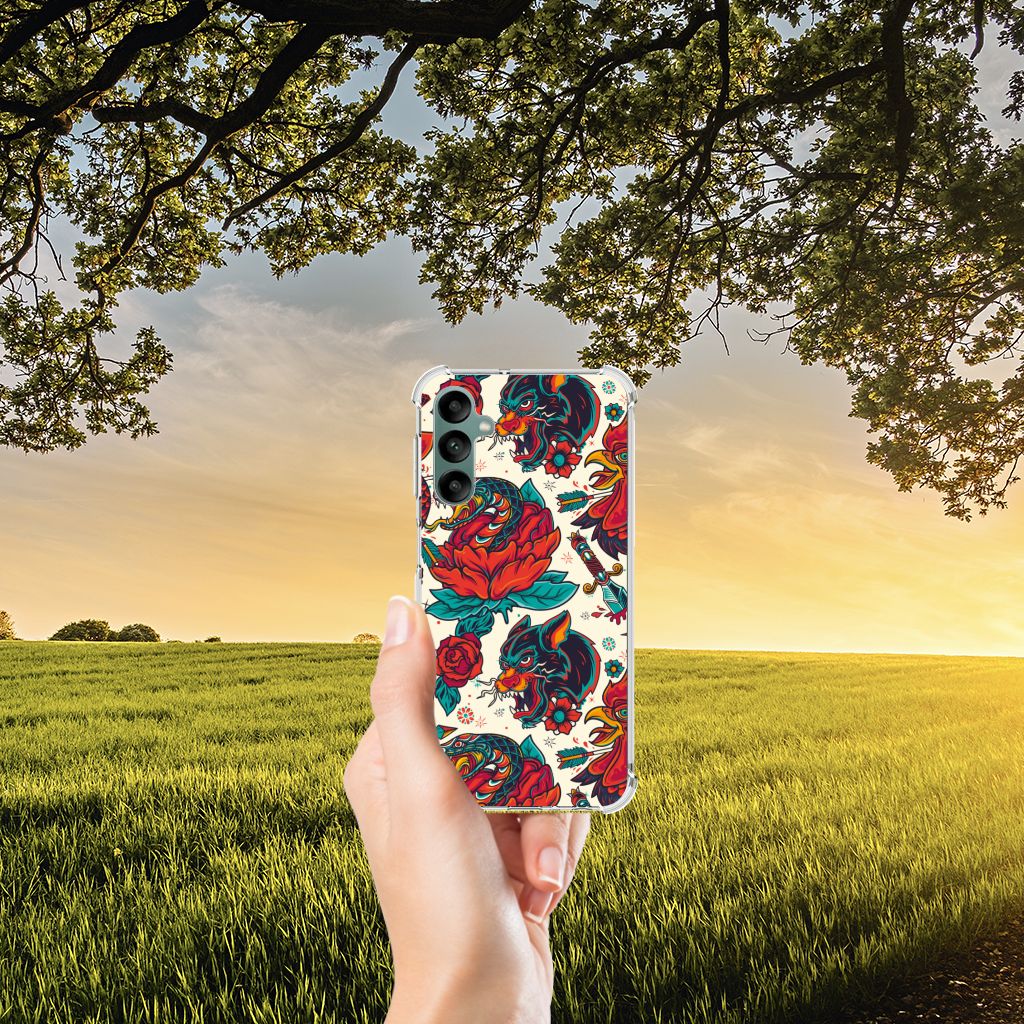 Ben je op zoek naar een stoer hoesje voor je Samsung Galaxy A24? Dan is dit hoesje in old skool stijl zeker iets voor jou! Het heeft wel iets weg van een tatoeage, vind je ook niet? Dit old skool vintage design wordt geprint op een Anti-shock Hoesje met foto. Het ligt prettig in de hand en is licht van gewicht. Ook fijn zijn de extra dikke hoeken en randen, waardoor je Samsung Galaxy A24 goed beschermd is. Alleen de achterkant van je telefoon wordt beschermd. Daarom adviseren wij om dit hoesje in combinatie met een screenprotector te gebruiken. Bestel vandaag nog dit telefoonhoesje met stoere old skool design!