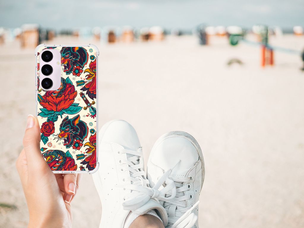 Ben je op zoek naar een stoer hoesje voor je Samsung Galaxy S24 Plus? Dan is dit hoesje in old skool stijl zeker iets voor jou! Het heeft wel iets weg van een tatoeage, vind je ook niet? Dit old skool vintage design wordt geprint op een Anti-shock Hoesje met foto. Het ligt prettig in de hand en is licht van gewicht. Ook fijn zijn de extra dikke hoeken en randen, waardoor je Samsung Galaxy S24 Plus goed beschermd is. Alleen de achterkant van je telefoon wordt beschermd. Daarom adviseren wij om dit hoesje in combinatie met een screenprotector te gebruiken. Bestel vandaag nog dit telefoonhoesje met stoere old skool design!