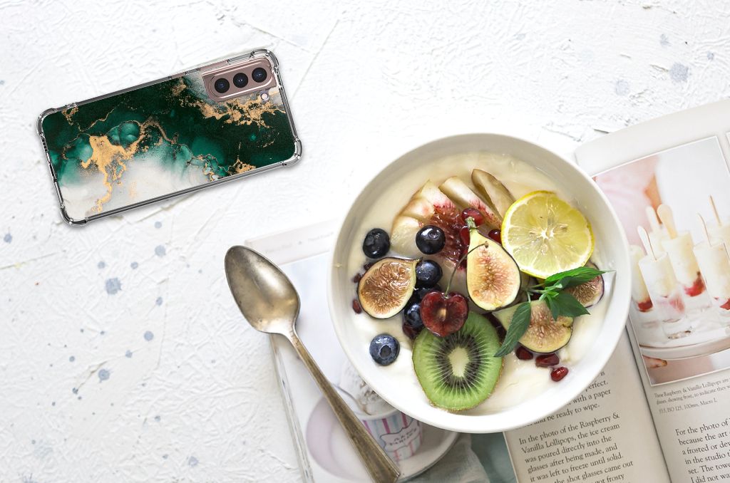 Wist je dat het design marmer zwart het meest verkochte hoesje is? Om onze collectie stenen uit te breiden hebben we het design marmer groen toegevoegd om jouw Samsung Galaxy S21 Plus nog meer op te laten vallen. Dit marmer groene design wordt geprint op een Anti-Shock Hoesje. Het ligt prettig in de hand en is licht van gewicht. Ook fijn zijn de extra dikke hoeken en randen, waardoor je Samsung Galaxy S21 Plus goed beschermd is bij een val. Alleen de achterkant van je telefoon wordt beschermd. Daarom adviseren wij om dit hoesje in combinatie met een screenprotector te gebruiken. Bestel vandaag nog met dit telefoonhoesje met toffe marmer design hoesje!