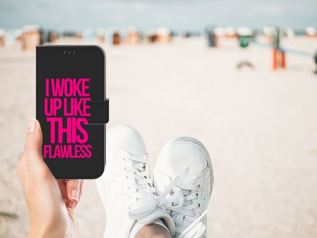Met dit zwarte Apple iPhone 11 Hoesje met naam met paarse tekst heb je een geweldige bescherming van je smartphone in handen. Dit zwarte hoesje met Woke Up tekst is een must voor jouw smartphone. Met dit design hoesje tekst val je ook zeker op. Je weet ook zeker dat het hoesje exclusief is. Het design is gemaakt door B2C Telecom. Het hoesje heeft verschillende vakjes en is aan alle zijden bedrukt. Ook het lipje aan de buitenkant kan worden bedrukt. De houder is van TPU, de buitenzijde van PU-leer. We willen je er ook op wijzen dat je zelf een hoesje kunt ontwerpen, met eigen beelden en teksten. Met onze Phone Case Designer kun je zelfs opvallende effecten, patronen en clip arts aan het ontwerp toevoegen.