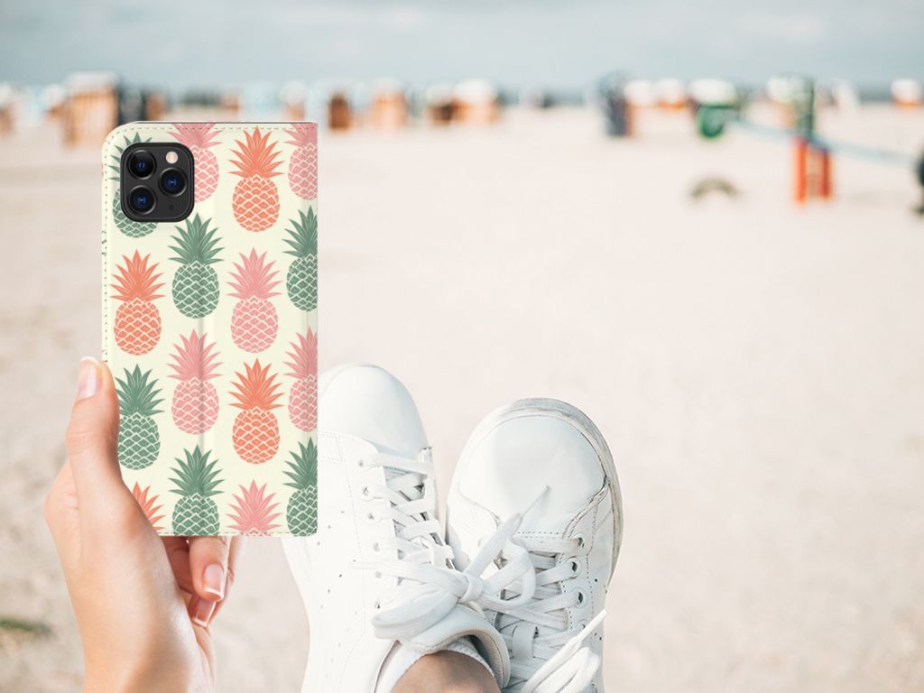 Ananas is een woord uit het Tupi, de taal van de Tupi-indianen, en betekent uitmuntende vrucht. Dit fruit van zeer hoge kwaliteit staat op onze superieure boekhoesjes, stand cases, hard cases en TPU cases. Jij blijft er gezond uitzien als je zo nu en dan een hap neemt van een Ananas , jouw smartphone blijft tip top in orde als je er een leuk telefoonhoesje omheen doet. Een ananas heeft stevig, veerkrachtig vruchtvlees. Een beetje te vergelijken met het TPU in onze hoesjes. TPU is elastisch materiaal, dat zeer buigzaam is. Vandaar dat het zeer schokbestendig is. Het ananas design staat op een stand case. Deze Apple iPhone 11 Pro Max Flip Style Cover beschermt jouw telefoon aan alle kanten en beschikt over een 1 opbergvakje en een speciale standaard. Het hoesje wordt afgesloten met een magneet aan de binnenzijde. De houder aan de binnenzijde is van TPU.