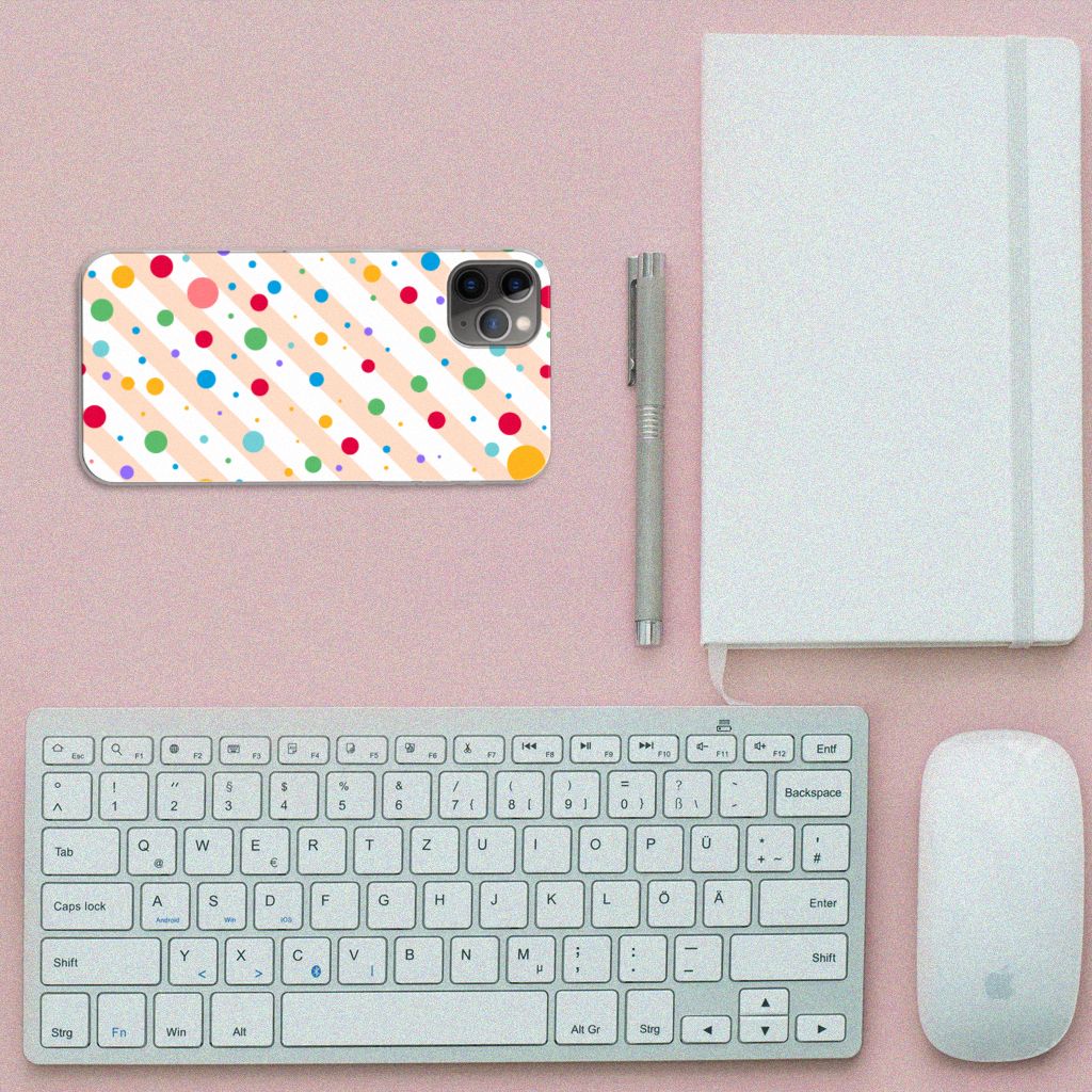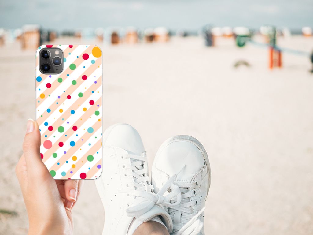 Een Apple iPhone 11 Pro Max TPU bumper met verschillende kleuren stippen is een schitterende bescherming van jouw smartphone. De tpu case met het design Dots in alle kleuren van de regenboog komt voor jou als geroepen. Maak je geen gebruik van dit zeer mooie hoesje, dan kan het met jouw smartphone een beetje beroerd aflopen. Deze mooie tpu case met verschillende soorten klompen in verschillende kleuren is zo’n beetje de meest flexibele case die er bestaat. Het hoesje met stippen zorgt voor een goede bescherming van je smartphone, vooral aan de achterzijde en zijkanten. Met een tpu hoesje met stippen in verschillende kleuren blijft jouw gsm volledig in tact. Heb je liever een tpu case met stippen in andere opvallende kleuren? Ontwerp dan zelf een tpu case met je eigen foto’s en teksten! De case wordt aan de achterzijde bedrukt met klompen, de zijkanten blijven doorzichtig.
