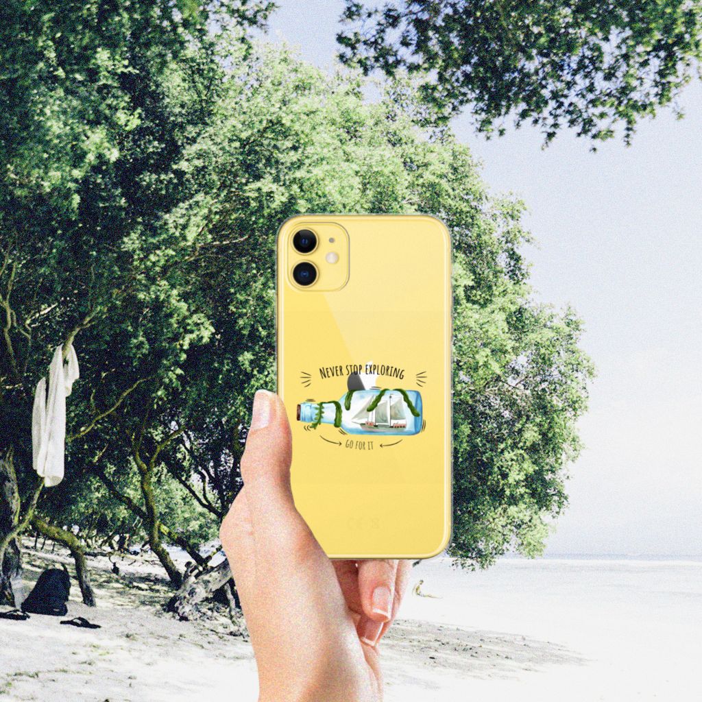 Dit leuke design met een schip in een fles is voor de echte avonturier of reiziger. Dankzij de tekst ‘Never stop exploring: Go for it’ word je altijd herinnerd aan het feit dat het volgende avontuur weer op de loer ligt! Dit design staat op een Telefoonhoesje met Naam voor je Apple iPhone 11. TPU is flexibel en heel erg sterk. Zo is je telefoon aan de achterkant en de randen heel goed beschermd. De case is aan de bovenkant bedrukt, de randen blijven transparant. Het TPU-hoesje is perfect te combineren met een screenprotector, zo zijn je telefoon en je beeldscherm altijd goed beschermd.