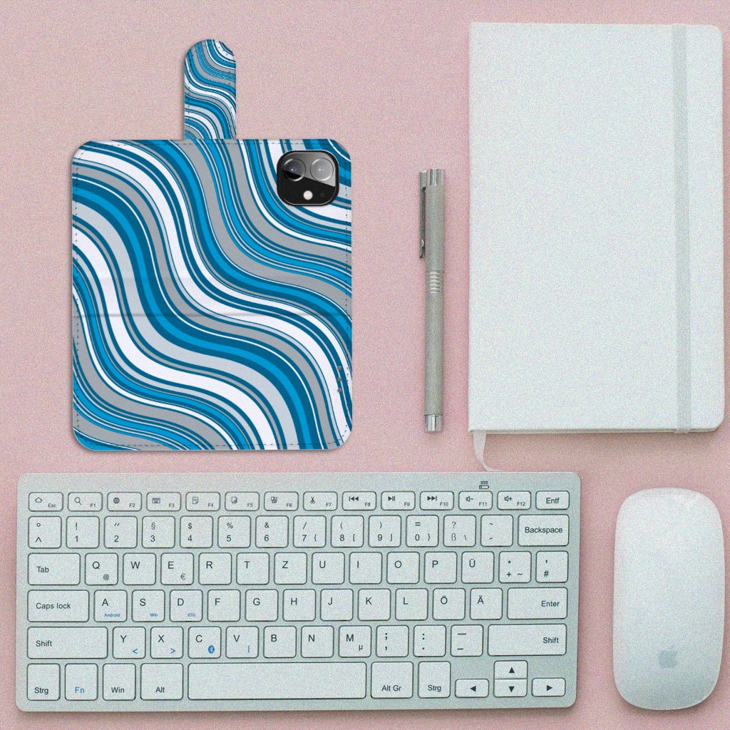 Zeer cool, dit hoesje met vooral blauwe kleuren, die in een golvende beweging jouw telefoon van een mooie uitstraling voorzien. Tijdens een zonnige vakantie aan zee is jouw smartphone perfect beschermd met dit telefoonhoesje. Het design Waves Blue van dit smartphone hoesje doet lichtjes denken aan een lolly, waarmee je een klein kind zeer blij maakt. Jouw Apple iPhone 12 Mini zal er ook zeer vrolijk uitzien samen met dit design hoesje. De witte en grijze kleuren staan in mooi contrast met het blauw, waardoor de uitstraling van deze accessoire zeer mooi is. Ook voor andere kleuren kun je natuurlijk uitstekend terecht in ons assortiment. Het design staat op een boekhoesje. Dit Telefoon Hoesje beschermt jouw telefoon aan alle zijden en beschikt over verschillende opbergvakjes voor pasjes en briefgeld. De case sluit perfect af met het lipje aan de buitenkant. De houder aan de binnenzijde is van TPU.
