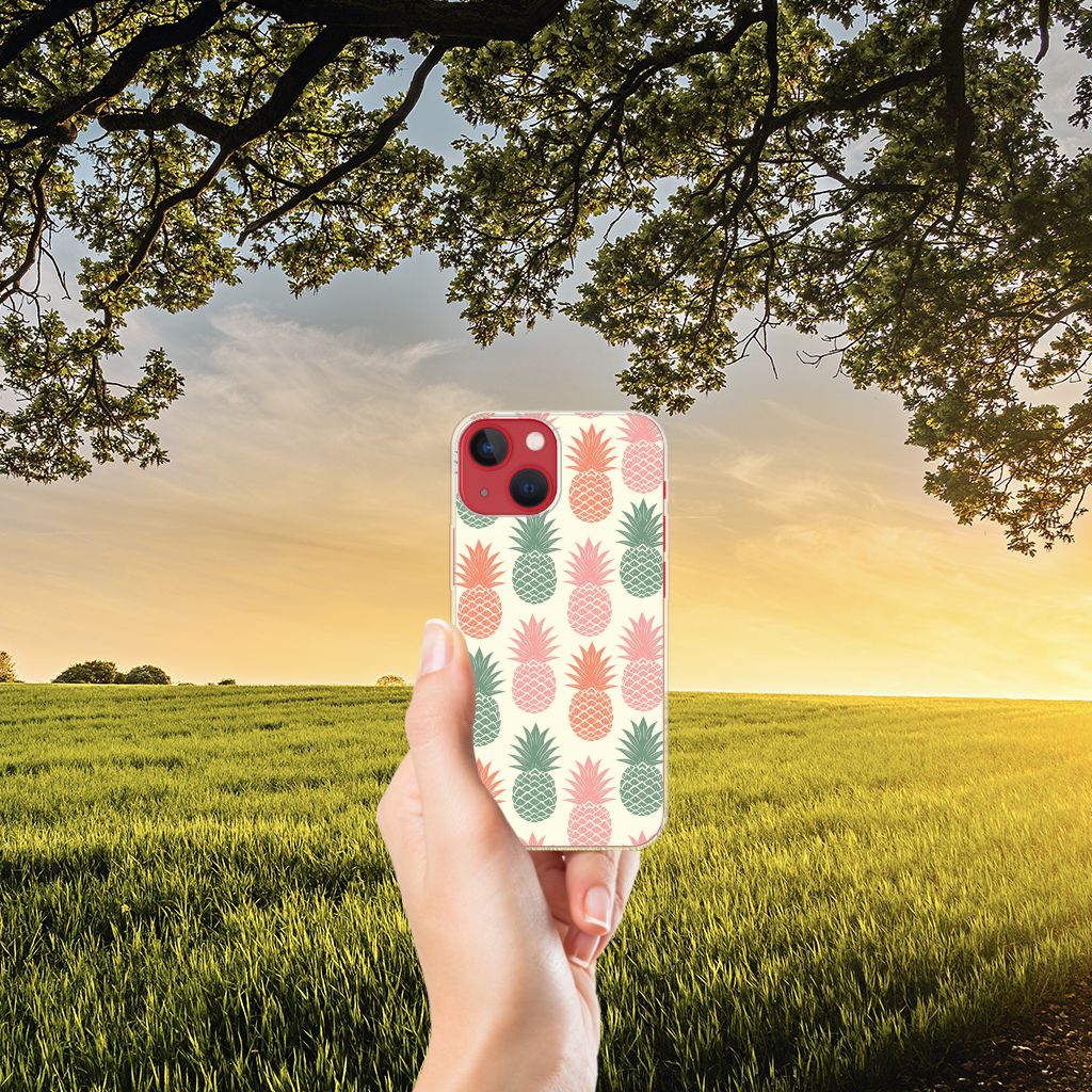 Ananas is een woord uit het Tupi, de taal van de Tupi-indianen, en betekent uitmuntende vrucht. Dit fruit van zeer hoge kwaliteit staat op onze superieure boekhoesjes, stand cases, hard cases en TPU cases. Jij blijft er gezond uitzien als je zo nu en dan een hap neemt van een Ananas , jouw smartphone blijft tip top in orde als je er een leuk telefoonhoesje omheen doet. Een ananas heeft stevig, veerkrachtig vruchtvlees. Een beetje te vergelijken met het TPU in onze hoesjes. TPU is elastisch materiaal, dat zeer buigzaam is. Vandaar dat het zeer schokbestendig is. Het ananas design staat op een staat op een TPU case. Deze Apple iPhone 13 Siliconen Case wordt alleen aan de bovenkant bedrukt en is zeer flexibel. De randen van het hoesje blijven transparant.