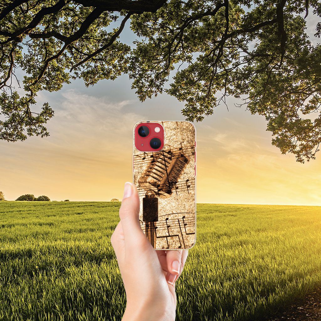 Ben je muzikant, dan is dit design hoesje met Bladmuziek wellicht echt iets voor jou. Met de intrede van nieuwe media wordt de rol van papieren bladmuziek teruggedrongen. Steeds vaker treft men 'bladmuziek' op een beeldschermapparaat, zoals een tablet-pc, e-reader of iPad aan. Gelukkig maar, want als er geen nieuwe media zouden zijn, hadden wij ook nooit onze Phone Case Designer kunnen ontwerpen. Met deze unieke ontwerpmodule kun je jouw favoriete band of artiest op je smartphone hoesje zetten, maar je kunt ook gaan voor dit prachtige design hoesje met print van bladmuziek. Het design staat op een Apple iPhone 13 Siliconen Hoesje met foto. Deze case beschermt jouw telefoon vooral aan de achterzijde en zijkanten en is zeer flexibel. Het hoesje blijft aan de zijkanten transparant, de bovenkant is geheel bedrukt. TPU is onbreekbaar materiaal, dat zeer schokabsorberend is. Het hoesje past altijd in je broekzak en combineert uitstekend met een screenprotector.