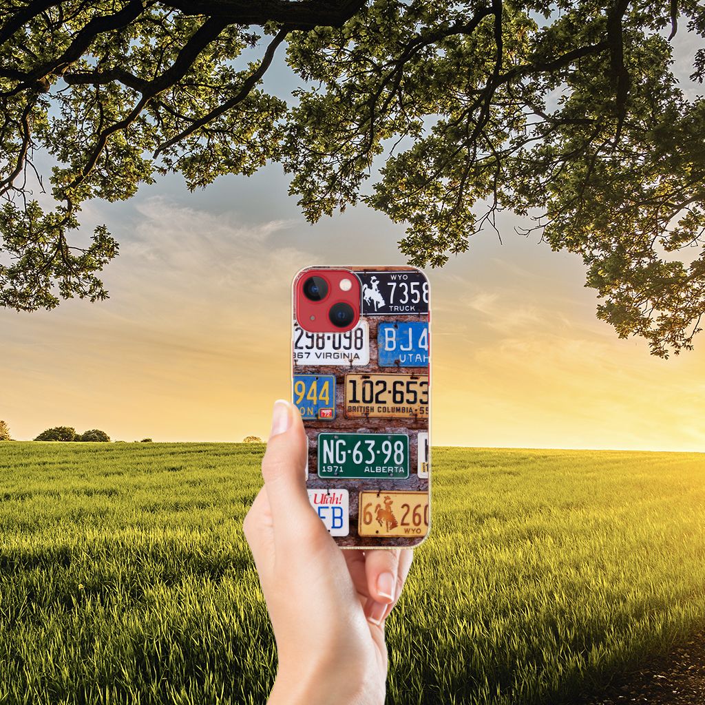 Je gaat waarschijnlijk helemaal uit je plaat met deze Apple iPhone 13 Siliconen Hoesje met foto met Amerikaanse Kentekenplaten. Kentekenplaten van Utah, Virginia, Nebraska, Kansas en Iowa: ze komen allemaal voorbij op deze opzienbarende tpu case, te koop voor een zeer scherpe prijs. Behalve een hoes met een fraaie print van kentekenplaten krijg je ook een case met zeer veel praktische eigenschappen. Zoals het elastische materiaal, dat de ergste schokken en stoten zeer makkelijk opvangt als je telefoon op de grond valt. De case wordt aan de bovenkant bedrukt, terwijl de zijkanten transparant blijven. De case heeft opstaande randen, waardoor het scherm extra beschermd is. Samen met een screenprotector is een betere bescherming dan deze tpu case met Amerikaanse kentekenplaten nauwelijks denkbaar.