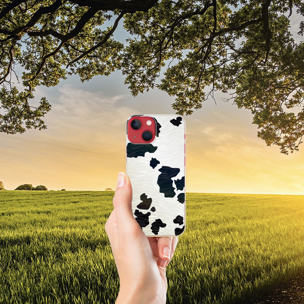 De vlekken op de huid van een koe hebben een camouflage functie. Met deze Apple iPhone 13 TPU Hoesje met Koeienvlekken hoef je je geen zorgen te maken dat je smartphone schade oploopt. De koeienvlekken zetten we op een tpu case op het moment dat jij je bestelling plaatst. Hierdoor krijgt jouw telefoon een print van koeienvlekken van zeer hoge kwaliteit. Ook omdat we het bedrukken van deze case geheel zelf doen. Jouw telefoon is vooral aan de achterkant en zijkanten goed beschermd. De print van koeienvlekken komt op de bovenkant van het hoesje te staan, de randen blijven doorzichtig. Roofdieren zijn niet geïnteresseerd in koeien dankzij de vlekken op hun huid. Deze beschermende werking heeft ook jouw hoesje met koeienprint.