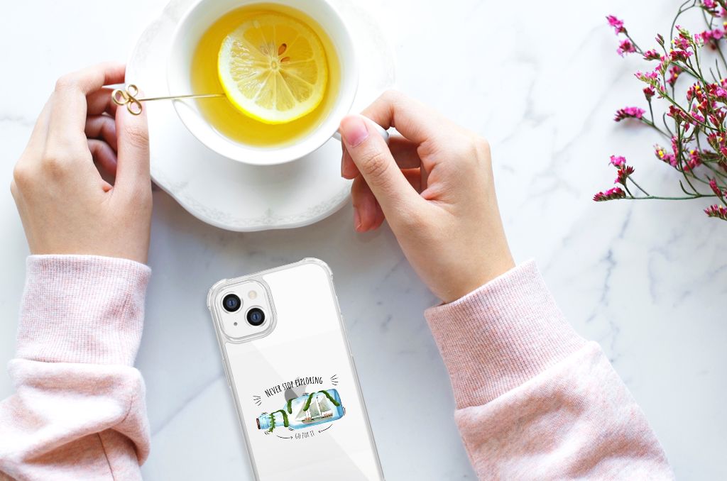 Dit leuke design met een schip in een fles is voor de echte avonturier of reiziger. Dankzij de tekst ‘Never stop exploring: Go for it’ word je altijd herinnerd aan het feit dat het volgende avontuur weer op de loer ligt! Dit design staat op een Stevig Bumper Hoesje voor je Apple iPhone 14 Plus. Een TPU Case anti-shock is perfect voor de actieve smartphonegebruiker. Denk aan mensen die veel sporten, reizen of wandelen en net iets meer zekerheid willen als het op hun geliefde telefoon aankomt. Het hoesje biedt stevige bescherming dankzij de opstaande randen. Het hoesje is volledig gemaakt van TPU, een supersterk maar ook licht en flexibel materiaal dat jouw telefoon optimaal beschermt.