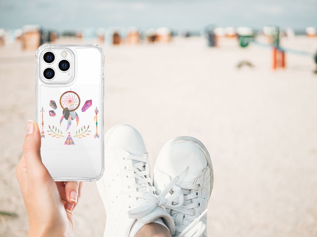 Een dromenvanger werd lang geleden al door een indianenvolk in Noord-Amerika gebruikt om nare dromen te weren. Nu nog hangen mensen over de hele wereld dromenvangers boven hun bed. Maar ook op een telefoonhoesje staat zo’n boho dreamcatcher heel mooi. Dit mooie design dat bestaat uit een tipi, pijlen en dromenvanger heeft veel verschillende prachtige kleuren. Maar omdat het ontwerp minimalistisch en klein is, is het design toch subtiel te noemen. Dit ontwerp staat op een Stevig Bumper Hoesje voor je Apple iPhone 14 Pro Max. Een TPU Case anti-shock is perfect voor de actieve smartphonegebruiker. Denk aan mensen die veel sporten, reizen of wandelen en net iets meer zekerheid willen als het op hun geliefde telefoon aankomt. Het hoesje biedt stevige bescherming dankzij de opstaande randen. Het hoesje is volledig gemaakt van TPU, een supersterk maar ook licht en flexibel materiaal dat jouw telefoon optimaal beschermt.