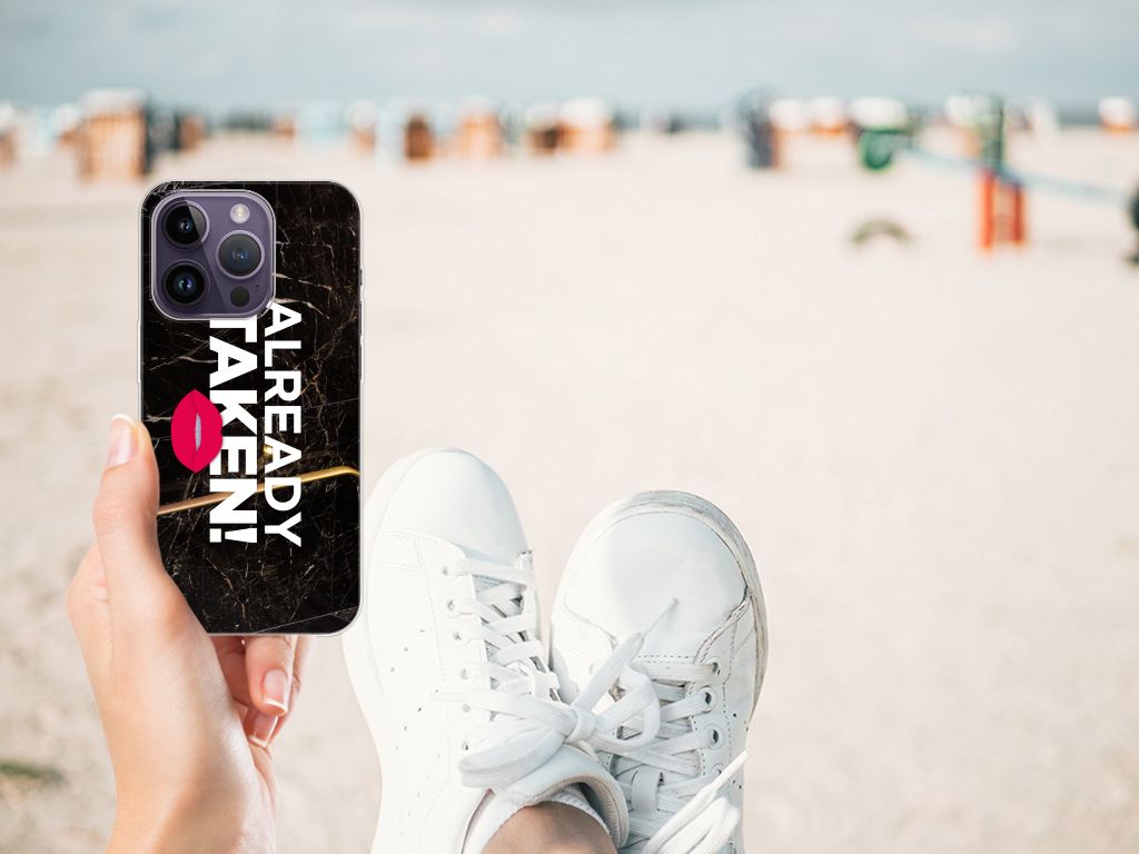Met deze Apple iPhone 14 Pro Siliconen hoesje met naam met Already Taken Black tekst maak je duidelijk dat jouw smartphone een kostbaar bezit is, waar je zeer lang over wilt beschikken. Je telefoon neem je waarschijnlijk vaak ter hand, dus dan zal de boodschap als je over dit hoesje beschikt zeker weten overkomen. De TPU case wordt alleen aan de bovenkant bedrukt en is zeer flexibel. De randen van het hoesje blijven transparant. Wil je een eigen tekst op je hoesje zetten? Dit kan ook, met onze Phone Case Designer. Deze unieke ontwerpmodule is ook geschikt om het design uit te breiden met foto’s, effecten en patronen.