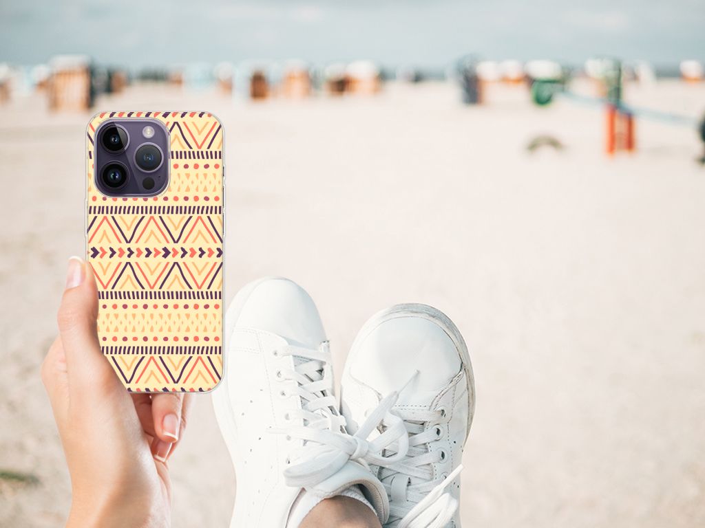 De Azteken leefden tussen 1200 en 1521 in het huidige Mexico. De mooie Aztec-patronen waar zij bekend om stonden, zien we nu nog op kleding, stoffen en tassen. Wie had toen kunnen bedenken dat we diezelfde prints honderden jaren later zelfs op een telefoonhoesje zouden vinden? Dit kleurrijke Aztec Yellow-hoesje is perfect voor iedereen die een stukje geschiedenis bij zich wil dragen maar ook gewoon een mooi patroon op zijn hoesje wil. Dit vrolijke, kleurrijke ontwerp staat op een TPU bumper voor de Apple iPhone 14 Pro. TPU is flexibel en onbreekbaar. Zo is je telefoon aan de achterkant en de randen heel goed beschermd. De case is aan de bovenkant bedrukt, de randen blijven transparant.