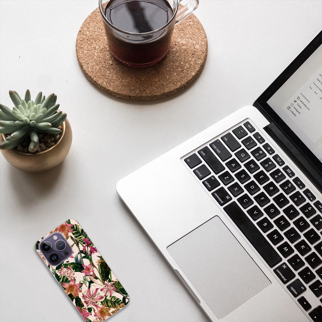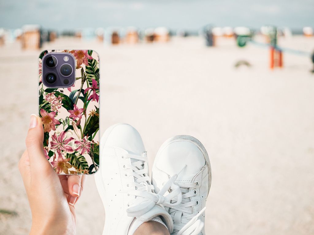 Dit Flowers design is een zegen voor de mens en zijn smartphone. De paarswitte bloemen en groene bladeren op deze Apple iPhone 14 Pro TPU Case geven jouw smartphone een zeer sierlijke uitstraling. Je wordt er ook meteen vrolijker van als je aan het appen, mailen of aan het bellen bent. Valt dan je telefoon op de grond, dan zal er dankzij de tpu case met paarswitte bloemen en groene bladeren geen schade ontstaan. Helemaal niet als je er een screenprotector bij hebt gekocht. Onze tpu cases met paarswitte bloemen en groene bladeren zien er zeer prettig uit en zijn heel praktisch, getuige onder meer de opstaande randen en het flexibele materiaal. Alleen de achterkant van de tpu case wordt bedrukt met paarswitte bloemen en groene bladeren, de randen blijven transparant. Op deze tpu case kun je trouwens ook in no time zelf foto’s van jouw favoriete bloemen zetten.