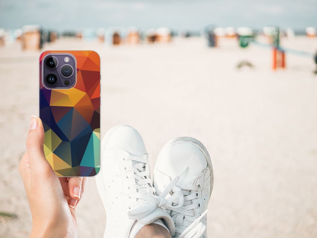 Veelkleurige driehoeken die samen eindeloze asymmetrische patronen lijken te vormen. Het is het abstracte schouwspel dat op dit fraaie hoesje voor je Apple iPhone 14 Pro direct de aandacht trekt noemen we voor het gemak trekt noemen we voor het gemak Polygon Color. De een ziet er een berglandschap in, de ander piramides. Wat zie jij erin? Zeker is in elk geval dat de aanblik van dit fascinerende ontwerp je niet snel gaat vervelen. Het kleurige spel van lijnen en vlakken blijft eindeloos boeien en geeft jouw TPU Hoesje een hippe en kunstzinnige uitstraling. De kracht die het lijnenspel uitstraalt, komt ook terug in het hoesje zelf. Dit hoesje wordt alleen aan de bovenkant bedrukt en is zeer flexibel. De randen van het hoesje blijven transparant. Wat wil je nog meer?
