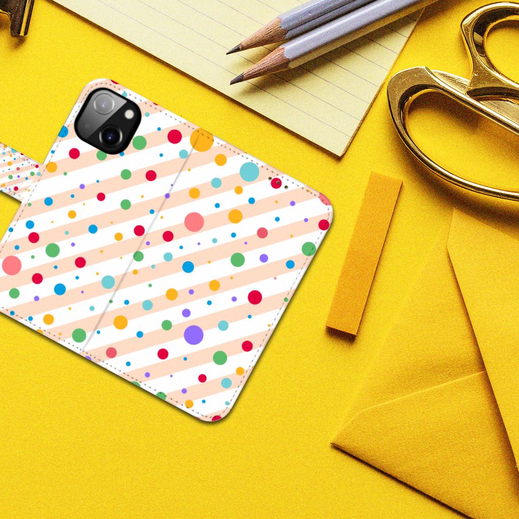 Een Apple iPhone 14 Telefoon Hoesje met verschillende kleuren stippen is een schitterende bescherming van jouw smartphone. Het boekhoesje met het design Dots in alle kleuren van de regenboog komt voor jou als geroepen. Maak je geen gebruik van dit zeer mooie hoesje, dan kan het met jouw smartphone een beetje beroerd aflopen. Dit mooie boekhoesje met verschillende kleuren stippen zorgt voor een volledige bescherming van je smartphone en wordt aan alle zijden bedrukt. Sommige stippen staan ook op het magnetische lipje aan de buitenzijde. Verder is de houder aan de binnenzijde van TPU. Jouw telefoon is dus zeer goed opgeborgen en kan geen kant op. Met een hoesje met stippen in verschillende kleuren op alle zijden blijft jouw telefoon volledig in tact. Heb je liever een boekhoesje met stippen in andere opvallende kleuren? Ontwerp dan zelf case met je eigen foto’s en teksten!