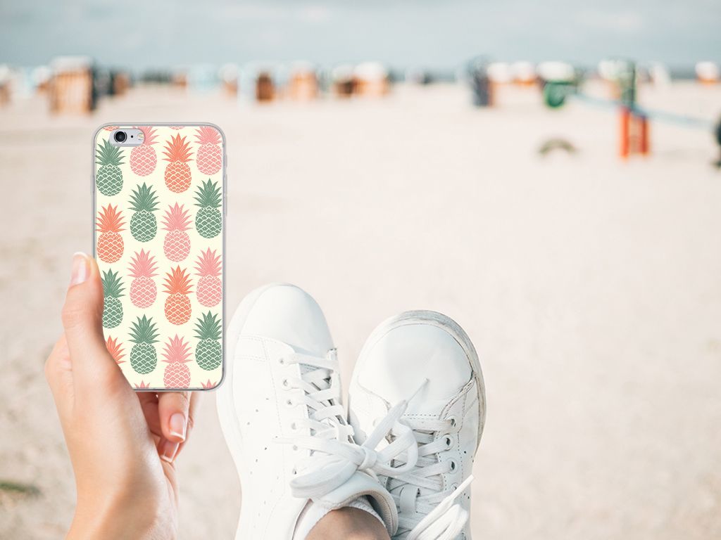 Ananas is een woord uit het Tupi, de taal van de Tupi-indianen, en betekent uitmuntende vrucht. Dit fruit van zeer hoge kwaliteit staat op onze superieure boekhoesjes, stand cases, hard cases en TPU cases. Jij blijft er gezond uitzien als je zo nu en dan een hap neemt van een Ananas , jouw smartphone blijft tip top in orde als je er een leuk telefoonhoesje omheen doet. Een ananas heeft stevig, veerkrachtig vruchtvlees. Een beetje te vergelijken met het TPU in onze hoesjes. TPU is elastisch materiaal, dat zeer buigzaam is. Vandaar dat het zeer schokbestendig is. Het ananas design staat op een staat op een TPU case. Deze Apple iPhone 6 | 6s Siliconen Case wordt alleen aan de bovenkant bedrukt en is zeer flexibel. De randen van het hoesje blijven transparant.