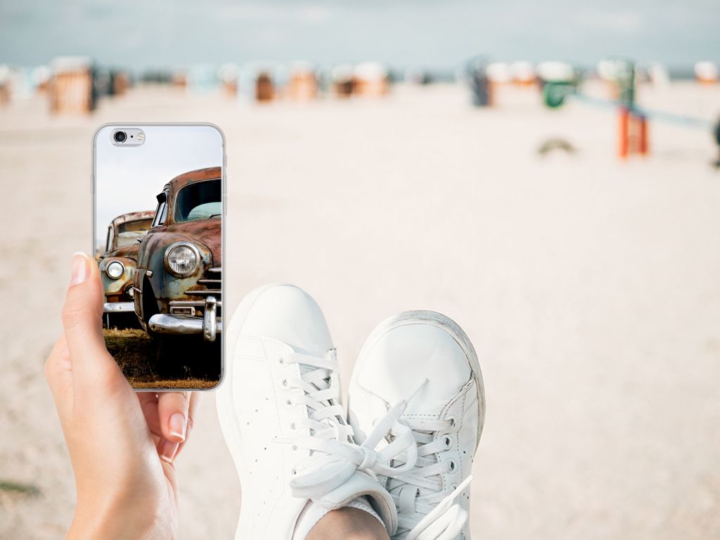 Autoliefhebbers met een voorkeur voor vintage zullen in hun nopjes zijn met dit design hoesje. We hebben een boekhoesje met print van Vintage Auto speciaal op maat gemaakt voor jouw smartphone. Door de achtergrond van dit hoesje krijgt de case met vintage auto’s echt een mooie retro look. Een Apple iPhone 6 | 6s Siliconen Hoesje met foto is een zeer flexibel hoesje. Dit komt onder andere door het elastische en onbreekbare materiaal waarvan de hoes is gemaakt. Verder is de case zeer praktisch. Wat denk je bijvoorbeeld van de opstaande randen aan de voorkant. Verder beschikt de case ook nog eens over alle noodzakelijke uitsparingen. Een TPU case wordt alleen aan de bovenkant bedrukt. De randen blijven volledig doorzichtig.