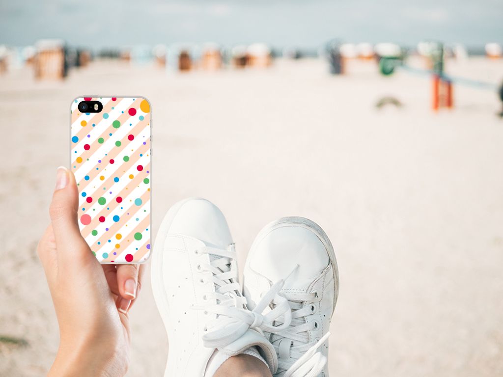 Een Apple iPhone SE | 5S TPU bumper met verschillende kleuren stippen is een schitterende bescherming van jouw smartphone. De tpu case met het design Dots in alle kleuren van de regenboog komt voor jou als geroepen. Maak je geen gebruik van dit zeer mooie hoesje, dan kan het met jouw smartphone een beetje beroerd aflopen. Deze mooie tpu case met verschillende soorten klompen in verschillende kleuren is zo’n beetje de meest flexibele case die er bestaat. Het hoesje met stippen zorgt voor een goede bescherming van je smartphone, vooral aan de achterzijde en zijkanten. Met een tpu hoesje met stippen in verschillende kleuren blijft jouw gsm volledig in tact. Heb je liever een tpu case met stippen in andere opvallende kleuren? Ontwerp dan zelf een tpu case met je eigen foto’s en teksten! De case wordt aan de achterzijde bedrukt met klompen, de zijkanten blijven doorzichtig.