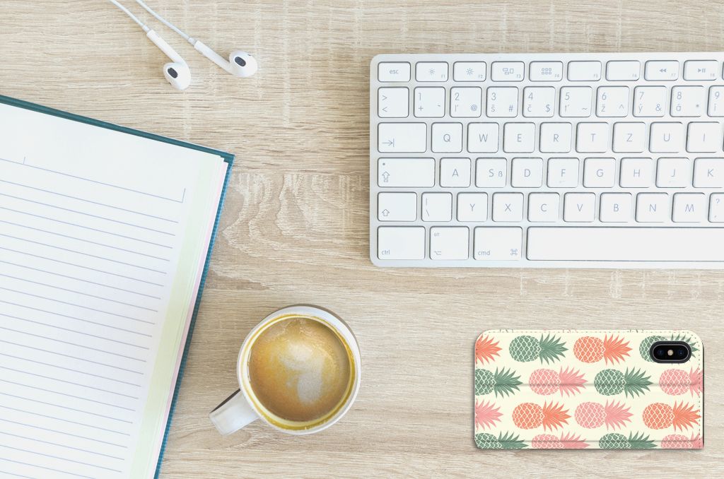 Ananas is een woord uit het Tupi, de taal van de Tupi-indianen, en betekent uitmuntende vrucht. Dit fruit van zeer hoge kwaliteit staat op onze superieure boekhoesjes, stand cases, hard cases en TPU cases. Jij blijft er gezond uitzien als je zo nu en dan een hap neemt van een Ananas , jouw smartphone blijft tip top in orde als je er een leuk telefoonhoesje omheen doet. Een ananas heeft stevig, veerkrachtig vruchtvlees. Een beetje te vergelijken met het TPU in onze hoesjes. TPU is elastisch materiaal, dat zeer buigzaam is. Vandaar dat het zeer schokbestendig is. Het ananas design staat op een stand case. Deze Apple iPhone X | Xs Flip Style Cover beschermt jouw telefoon aan alle kanten en beschikt over een 1 opbergvakje en een speciale standaard. Het hoesje wordt afgesloten met een magneet aan de binnenzijde. De houder aan de binnenzijde is van TPU.