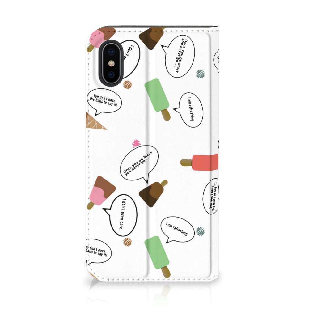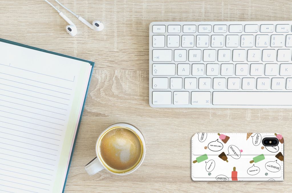 Van deze vrolijke Apple iPhone X | Xs Flip Style Cover met daarop verschillende soorten ijsjes met tekstwolkjes krijg je sowieso een vrij en zomers gevoel. De zomer komt naar je toe met deze print van ijsjes met tekstwolkjes. Ben je op het strand, dan ontbreekt een lekker ijsje natuurlijk niet. Net zoals je je smartphone bij de hand hebt, met daaromheen een design hoesje met bijzondere ijsjes en tekstwolkjes. Jouw telefoon kan dan de bescherming in de vorm van een stand case met ijsjes zeer goed gebruiken. Alle zijden van dit hoesje worden bedrukt met ijsjes en dankzij de speciale standaard is het erg prettig om filmpjes te bekijken. De case wordt aan de binnenzijde met een magneet afgesloten en de houder aan de binnenzijde is van TPU. Onder alle weersomstandigheden zal deze case met 1 opbergvakje en ijsjes perfect functioneren, ook op het strand met een ijsje in je hand.