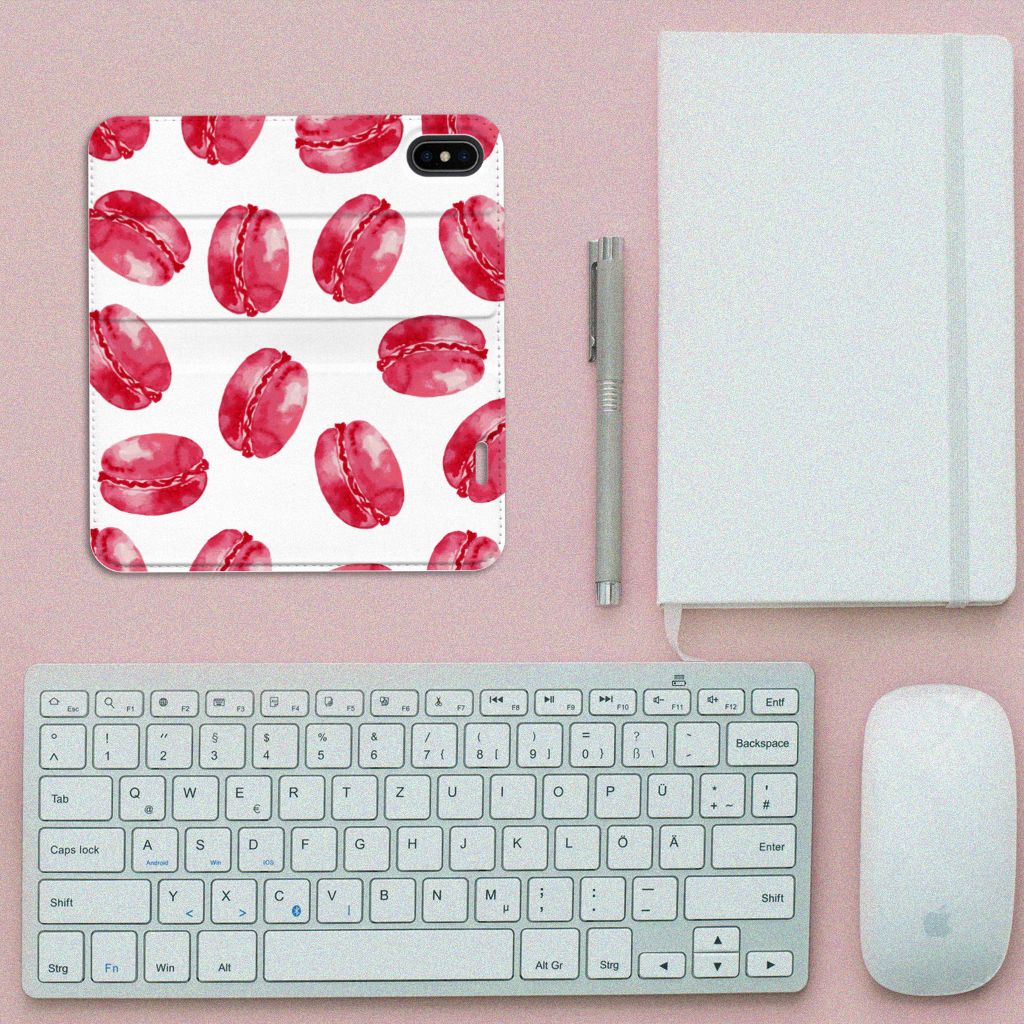Dit stand hoesje met Pink Macarons is een zeer opvallende bescherming voor jouw smartphone. Macarons zijn Franse koekjes: kleine, rond en luchtig. Ze worden in veel verschillende smaken gemaakt, herkenbaar aan de verschillende kleuren zoals chocolade (donkerbruin), mokka (middenbruin), kersen (rood), pistache (groen), aardbei (roze), framboos (karmijn). Deze kleuren kun je net allemaal zien op dit fraaie design hoesje met roze macarons. Heb je altijd al een Apple iPhone X | Xs Flip Style Cover willen hebben met roze macarons? Grijp dan nu je kans. Deze case heeft zeer veel goede eigenschappen, zoals 1 opbergvakje en een magnetische sluiting aan de binnenkant. Dit design hoesje met roze macarons wordt aan alle zijden bedrukt. De houder aan de binnenkant van het hoesje is van TPU. De case heeft ook een handige standaard.