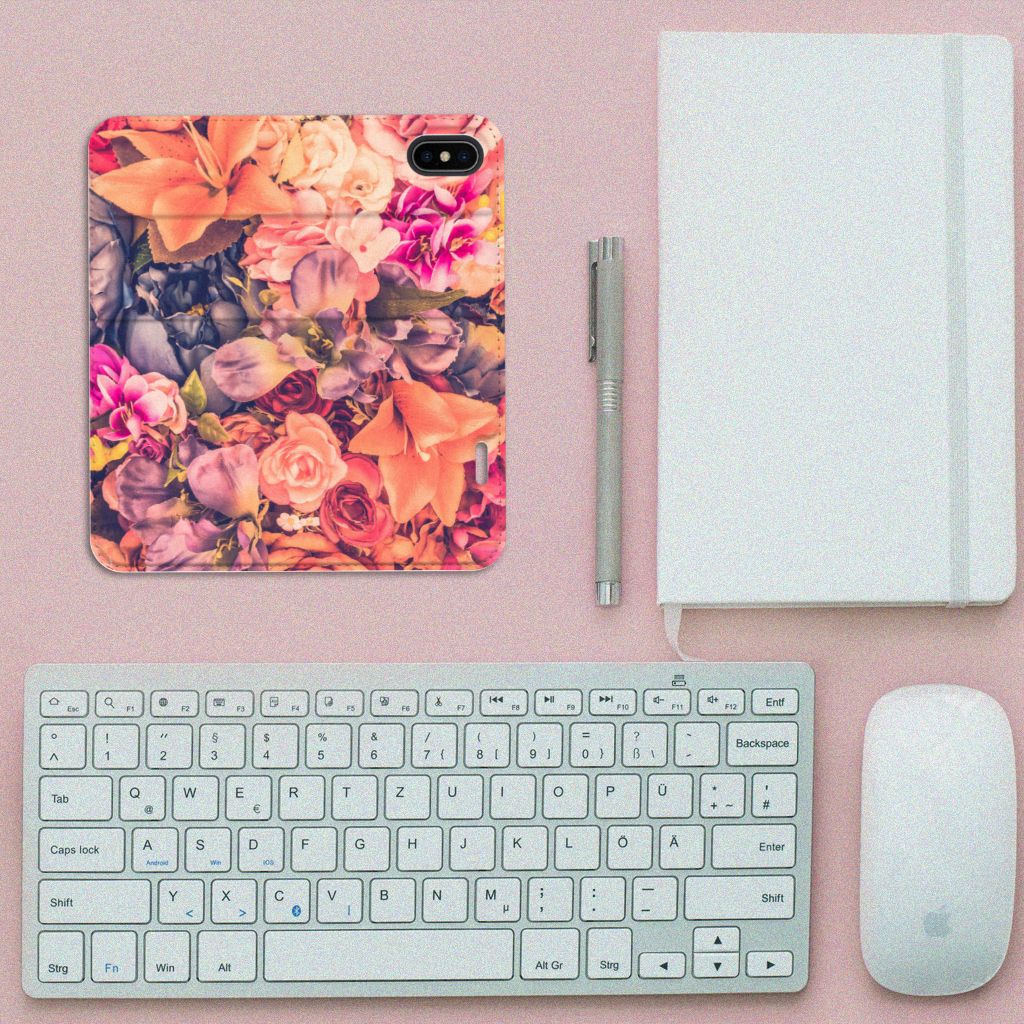 Dit Bosje Bloemen doet een mens en zijn smartphone goed. De oranje, paarse en roze bloemen op deze Apple iPhone X | Xs Smart Cover geven jouw smartphone een zeer sierlijke uitstraling. Je wordt er ook meteen vrolijker van als je aan het appen, mailen of aan het bellen bent. Valt dan je telefoon op de grond, dan zal er dankzij de stand case met oranje, paarse en roze bloemen geen schade ontstaan. Onze stand cases met oranje, paarse en roze bloemen bieden de allerbeste bescherming en zijn heel praktisch, wat blijkt uit onder meer het vakje aan de binnenkant en de handige standaard waarmee je de smartphone rechtop op tafel neer kunt zetten. De oranje, paarse en roze bloemen passen goed op alle zijden van de case. Op deze stand case van leer en TPU (houder aan de binnenkant) is het ook mogelijk je eigen ontwerp te zetten. In no time maak je zelf een stand case met daarop foto’s van jouw favoriete bloemen.