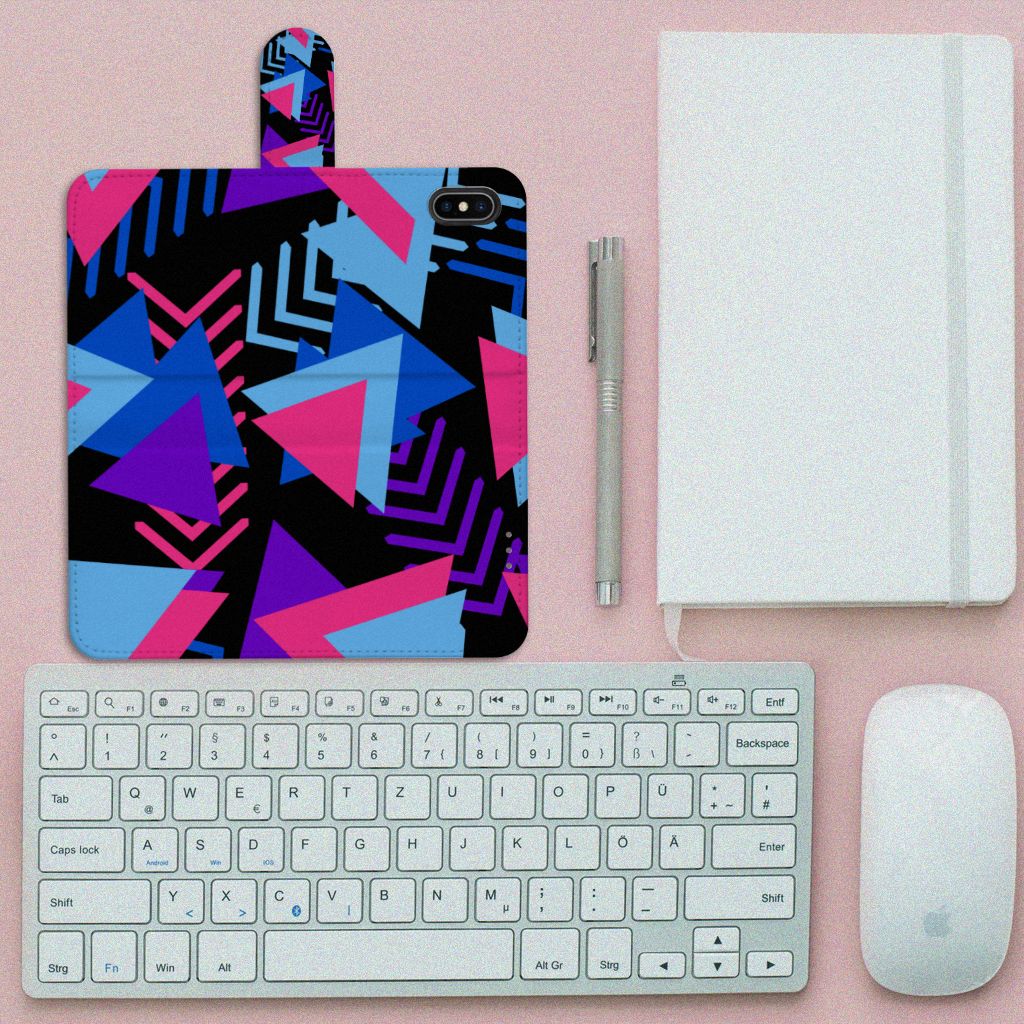 Dit fraaie hoesje met het design Funky Triangle is alles behalve eenvoudig en sober. Dat komt goed uit, want je hebt natuurlijk ook geen doorsnee telefoon gekocht. Mocht je dat wel hebben gedaan, dan wordt hij meteen speciaal als je een Apple iPhone Xs Max Book Case koopt voor een spotprijsje. Een ding is zeker: opvallen ga je beslist met dit hoesje met paarse, roze en blauwe driehoeken. Jij zult in je element zijn met dit design hoesje met paarse, roze en blauwe driehoeken, omdat het er schitterend uitziet en jouw telefoon perfect beschermt. Het smartphonehoesje beschermt jouw telefoon aan alle zijden en beschikt over verschillende houders voor pasjes en briefgeld. De case sluit perfect af met een lipje aan de buitenkant. De houder aan de binnenzijde is van TPU. Alle zijden van het hoesje worden bedrukt, inclusief het lipje. De paarse, roze en blauwe driehoeken maken de case helemaal af.