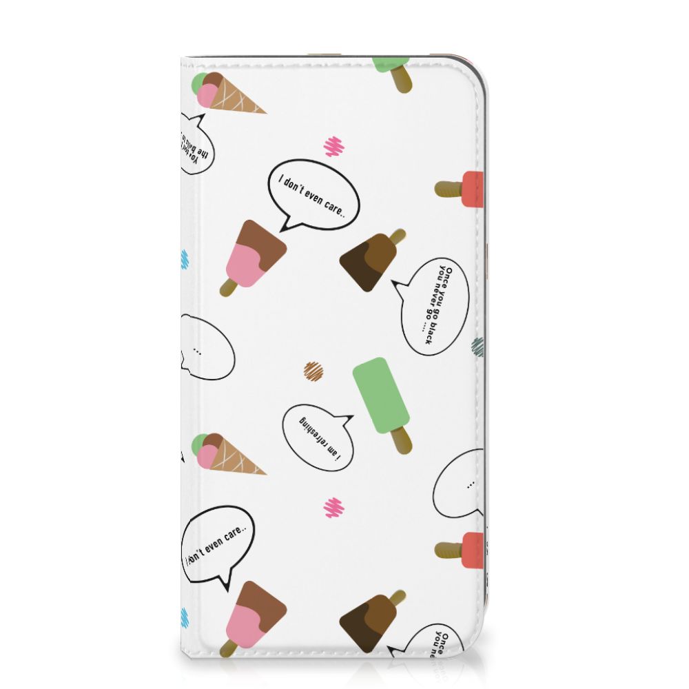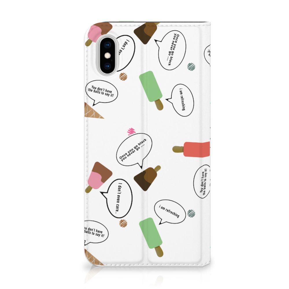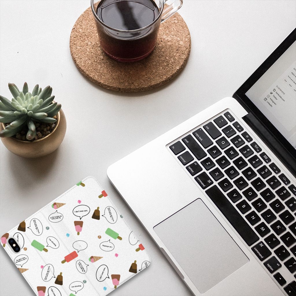 Van deze vrolijke Apple iPhone Xs Max Flip Style Cover met daarop verschillende soorten ijsjes met tekstwolkjes krijg je sowieso een vrij en zomers gevoel. De zomer komt naar je toe met deze print van ijsjes met tekstwolkjes. Ben je op het strand, dan ontbreekt een lekker ijsje natuurlijk niet. Net zoals je je smartphone bij de hand hebt, met daaromheen een design hoesje met bijzondere ijsjes en tekstwolkjes. Jouw telefoon kan dan de bescherming in de vorm van een stand case met ijsjes zeer goed gebruiken. Alle zijden van dit hoesje worden bedrukt met ijsjes en dankzij de speciale standaard is het erg prettig om filmpjes te bekijken. De case wordt aan de binnenzijde met een magneet afgesloten en de houder aan de binnenzijde is van TPU. Onder alle weersomstandigheden zal deze case met 1 opbergvakje en ijsjes perfect functioneren, ook op het strand met een ijsje in je hand.