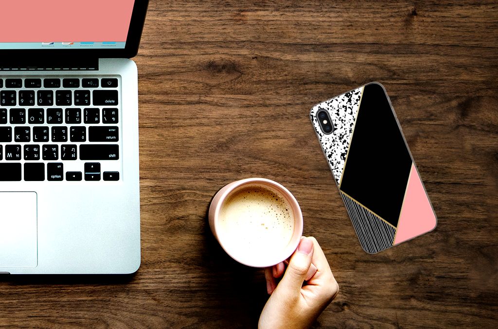 - Met een tpu-siliconen hoesje met roze, zwarte en witte vlakken blijft jouw telefoon in tact.