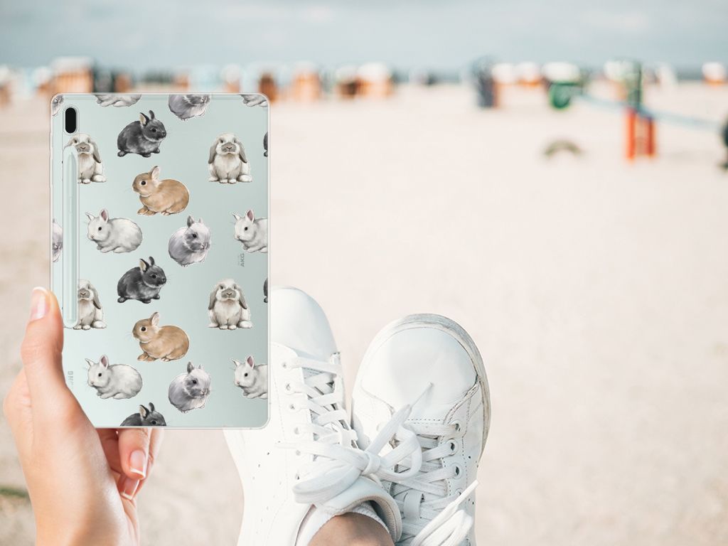 Wist je dat er wel 50 verschillende konijnenrassen zijn die zich onderscheiden in kleur, vacht, bouw en formaat? Daarom kon dit design met konijntjes eigenlijk niet ontbreken in onze collectie hoesjes. Wij zijn in ieder geval helemaal verliefd op deze schattige konijntjes. Dit design wordt geprint op een Back Case speciaal op maat gemaakt voor de Samsung Galaxy Tab S7FE. Het ligt prettig in de hand en is licht van gewicht. Alleen de achterkant van je tablet wordt beschermd. Daarom adviseren wij om dit hoesje in combinatie met een screenprotector te gebruiken. Bescherm jouw tablet vandaag nog met dit super schattige hoesje met konijntjes!