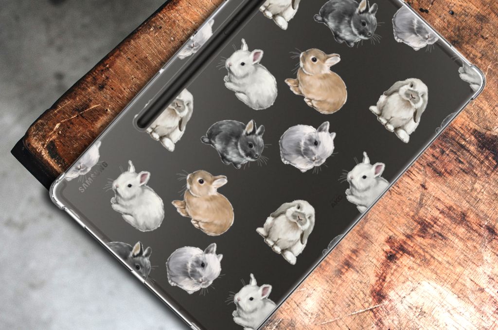 Wist je dat er wel 50 verschillende konijnenrassen zijn die zich onderscheiden in kleur, vacht, bouw en formaat? Daarom kon dit design met konijntjes eigenlijk niet ontbreken in onze collectie hoesjes. Wij zijn in ieder geval helemaal verliefd op deze schattige konijntjes. Dit design wordt geprint op een Back Case speciaal op maat gemaakt voor de Samsung Galaxy Tab S9 Plus. Het ligt prettig in de hand en is licht van gewicht. Alleen de achterkant van je tablet wordt beschermd. Daarom adviseren wij om dit hoesje in combinatie met een screenprotector te gebruiken. Bescherm jouw tablet vandaag nog met dit super schattige hoesje met konijntjes!