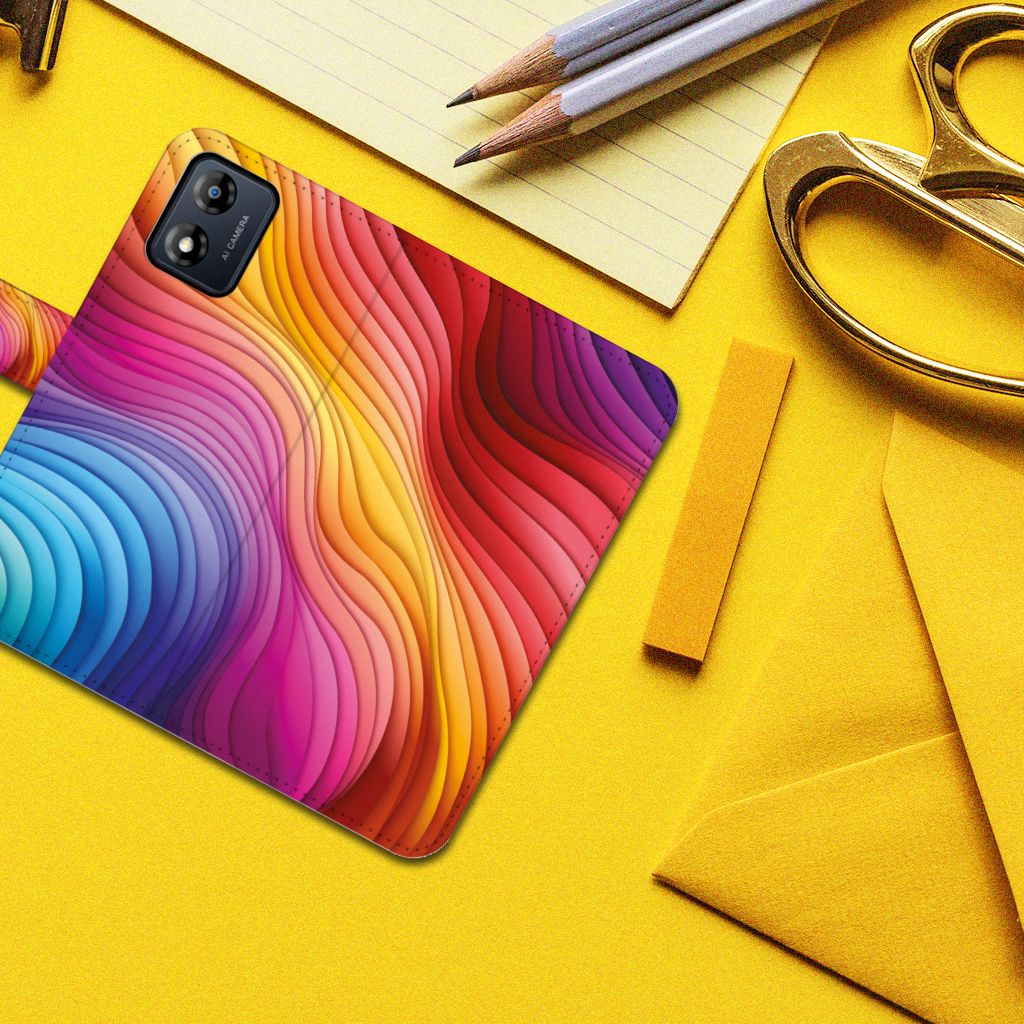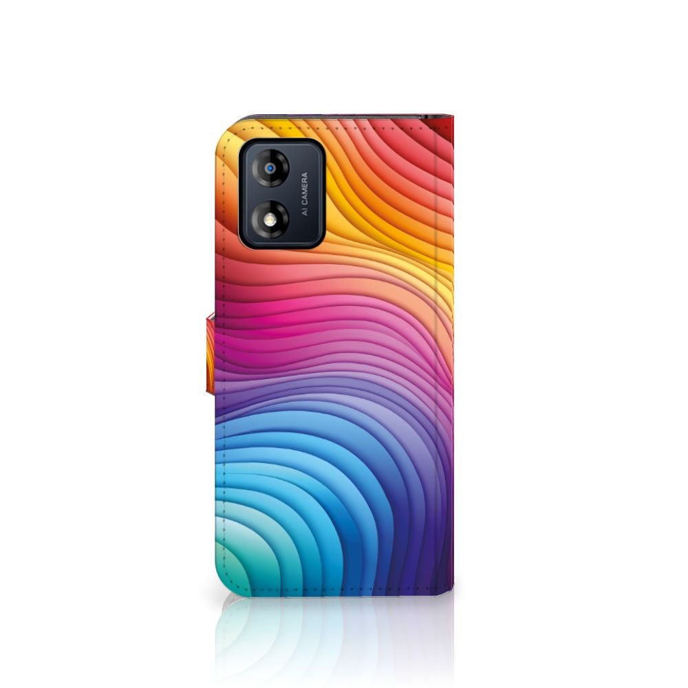 Een regenboog bestaat eigenlijk uit meer dan zeven kleuren, wist je dat? De zichtbare kleuren vloeien geleidelijk in elkaar over, waardoor er eigenlijk meer dan zeven kleuren zijn. Dat wij maar zeven ‘’stroken’’ licht zien, is dus eigenlijk gezichtsbedrog. Toch noemen wij dit hoesje regenboog, omdat wij er blij van worden! Dit design wordt geprint op een Book Case speciaal op maat gemaakt voor de Motorola Moto E13 4G. In dit hoesje kun je drie pasjes kwijt, super handig toch? Het hoesje wordt afgesloten met een sluit lipje, waardoor jouw telefoon altijd goed beschermd is. Bescherm je Motorola Moto E13 4G vandaag nog dit toffe regenboog hoesje!