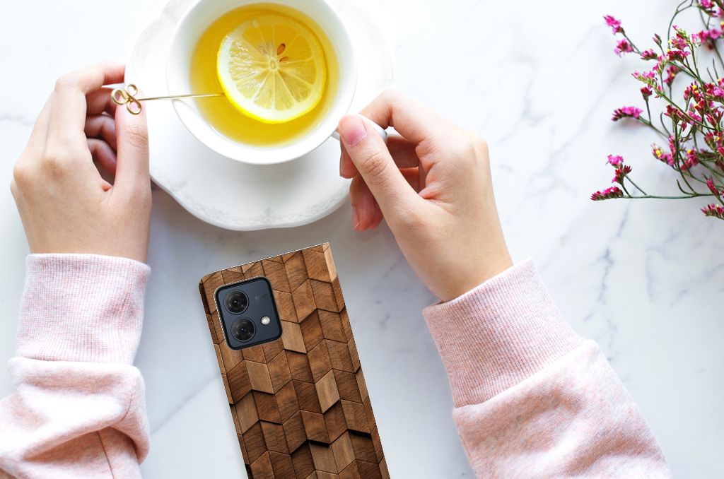 Onze houten hoesjes, niet letterlijk natuurlijk, maar onze design hoesjes met een bedrukking van hout print zijn erg populair. Daarom werd het tijd voor een uitbreiding van onze collectie houten hoesjes. Hoe tof is dit wooden cubes design? Gegarandeerd dat jij met een uniek hoesje rond loopt! Dit design wordt geprint op een Book Wallet Case speciaal op maat gemaakt voor de Motorola Moto G84. In dit hoesje kun je een pasje kwijt, super fijn toch? Vouw het hoesje om en zet het horizontaal neer voor als je graag filmpjes op je Motorola Moto G84 kijkt. De magneten aan de binnenkant zorgen ervoor dat het hoesje dicht blijft in bijv. je tas. Bescherm jouw smartphone vandaag nog met dit wooden cubes hoesje!