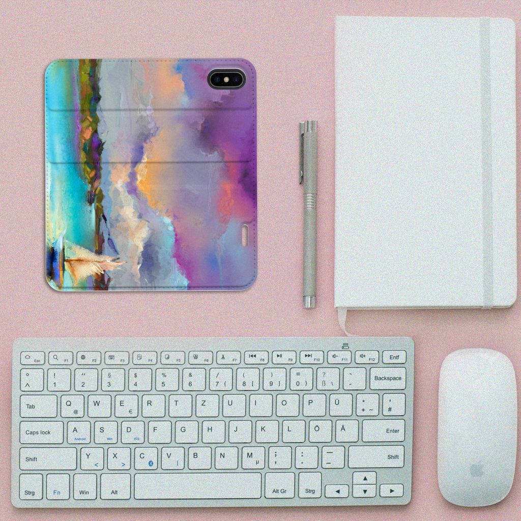 Het mooie ontwerp op dit hoesje zou je zo aan de muur willen hangen. Dit abstracte ‘schilderij’ van een bootje op een meer valt op vanwege de prachtige tinten blauw en paars. Een prachtig hoesje voor de liefhebber van kunst, boten en landschappen. Met een Bookcase is je Apple iPhone X | Xs goed beschermd. Dit populaire smartphonehoesje heeft één vakje voor een pasje of briefgeld en is aan alle zijden bedrukt. Met de standcase zet je je telefoon gemakkelijk neer, zodat je je handen vrij hebt als je bijvoorbeeld een video wilt kijken. De binnenkant van de standcase is van grijs PU-leer. Dat is fijn, omdat je daardoor niet snel vlekken ziet op je hoesje.