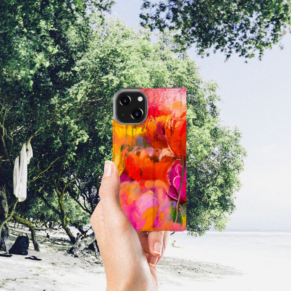 Apple iPhone 14 Telefoonhoesje met Pasjes Pauw met Bloemen