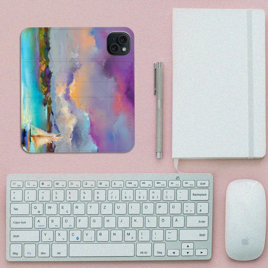 Het mooie ontwerp op dit hoesje zou je zo aan de muur willen hangen. Dit abstracte ‘schilderij’ van een bootje op een meer valt op vanwege de prachtige tinten blauw en paars. Een prachtig hoesje voor de liefhebber van kunst, boten en landschappen. Met een Bookcase is je iPhone 15 goed beschermd. Dit populaire smartphonehoesje heeft één vakje voor een pasje of briefgeld en is aan alle zijden bedrukt. Met de standcase zet je je telefoon gemakkelijk neer, zodat je je handen vrij hebt als je bijvoorbeeld een video wilt kijken. De binnenkant van de standcase is van grijs PU-leer. Dat is fijn, omdat je daardoor niet snel vlekken ziet op je hoesje.