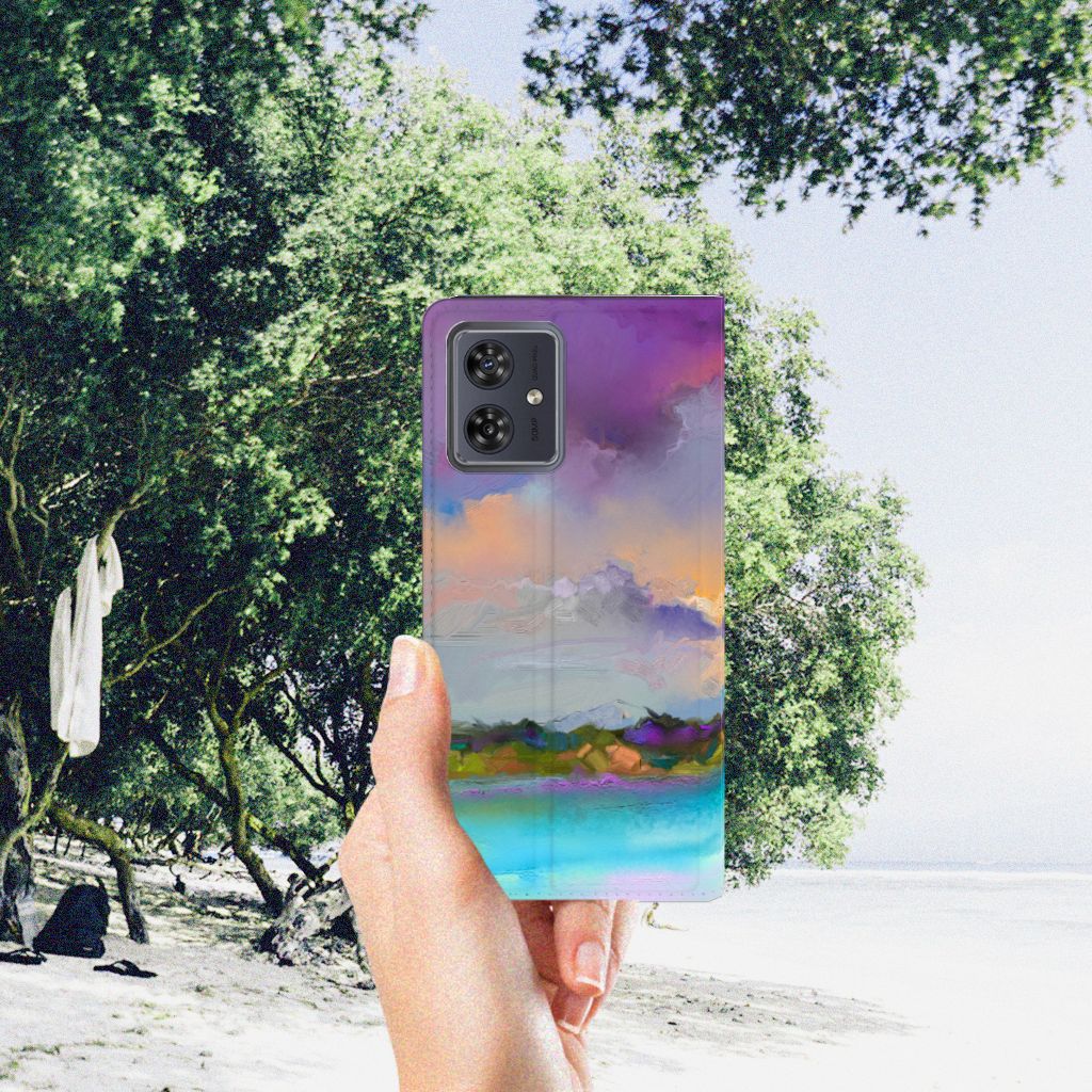 Het mooie ontwerp op dit hoesje zou je zo aan de muur willen hangen. Dit abstracte ‘schilderij’ van een bootje op een meer valt op vanwege de prachtige tinten blauw en paars. Een prachtig hoesje voor de liefhebber van kunst, boten en landschappen. Met een Bookcase is je Motorola Moto G54 goed beschermd. Dit populaire smartphonehoesje heeft één vakje voor een pasje of briefgeld en is aan alle zijden bedrukt. Met de standcase zet je je telefoon gemakkelijk neer, zodat je je handen vrij hebt als je bijvoorbeeld een video wilt kijken. De binnenkant van de standcase is van grijs PU-leer. Dat is fijn, omdat je daardoor niet snel vlekken ziet op je hoesje.