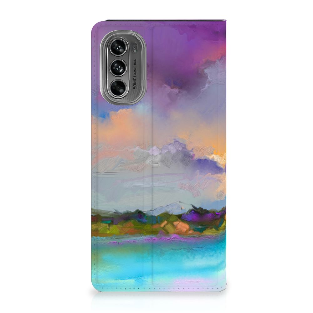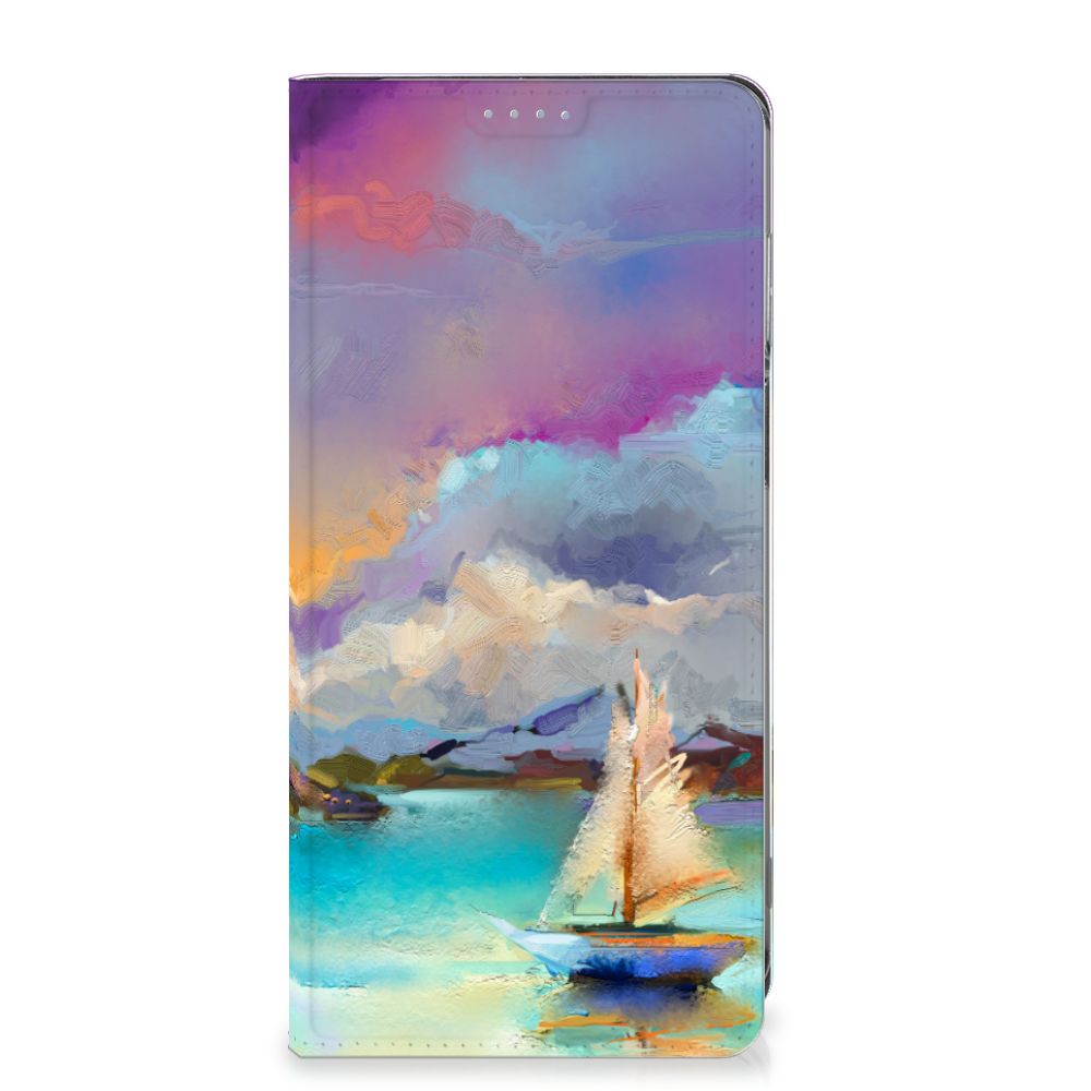 Het mooie ontwerp op dit hoesje zou je zo aan de muur willen hangen. Dit abstracte ‘schilderij’ van een bootje op een meer valt op vanwege de prachtige tinten blauw en paars. Een prachtig hoesje voor de liefhebber van kunst, boten en landschappen. Met een Bookcase is je Motorola Moto G62 5G goed beschermd. Dit populaire smartphonehoesje heeft één vakje voor een pasje of briefgeld en is aan alle zijden bedrukt. Met de standcase zet je je telefoon gemakkelijk neer, zodat je je handen vrij hebt als je bijvoorbeeld een video wilt kijken. De binnenkant van de standcase is van grijs PU-leer. Dat is fijn, omdat je daardoor niet snel vlekken ziet op je hoesje.