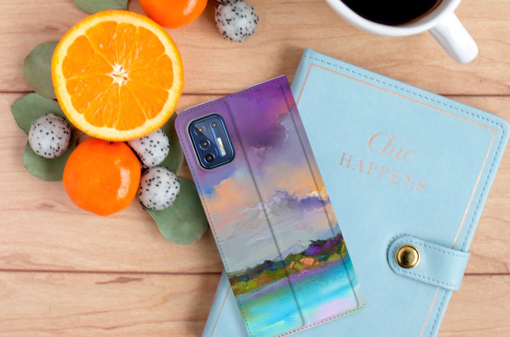 Het mooie ontwerp op dit hoesje zou je zo aan de muur willen hangen. Dit abstracte ‘schilderij’ van een bootje op een meer valt op vanwege de prachtige tinten blauw en paars. Een prachtig hoesje voor de liefhebber van kunst, boten en landschappen. Met een Bookcase is je Motorola Moto G9 Plus goed beschermd. Dit populaire smartphonehoesje heeft één vakje voor een pasje of briefgeld en is aan alle zijden bedrukt. Met de standcase zet je je telefoon gemakkelijk neer, zodat je je handen vrij hebt als je bijvoorbeeld een video wilt kijken. De binnenkant van de standcase is van grijs PU-leer. Dat is fijn, omdat je daardoor niet snel vlekken ziet op je hoesje.
