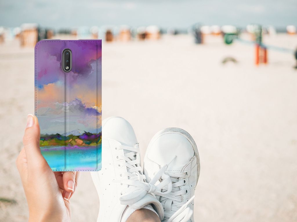 Het mooie ontwerp op dit hoesje zou je zo aan de muur willen hangen. Dit abstracte ‘schilderij’ van een bootje op een meer valt op vanwege de prachtige tinten blauw en paars. Een prachtig hoesje voor de liefhebber van kunst, boten en landschappen. Met een Bookcase is je Nokia 2.3 goed beschermd. Dit populaire smartphonehoesje heeft één vakje voor een pasje of briefgeld en is aan alle zijden bedrukt. Met de standcase zet je je telefoon gemakkelijk neer, zodat je je handen vrij hebt als je bijvoorbeeld een video wilt kijken. De binnenkant van de standcase is van grijs PU-leer. Dat is fijn, omdat je daardoor niet snel vlekken ziet op je hoesje.