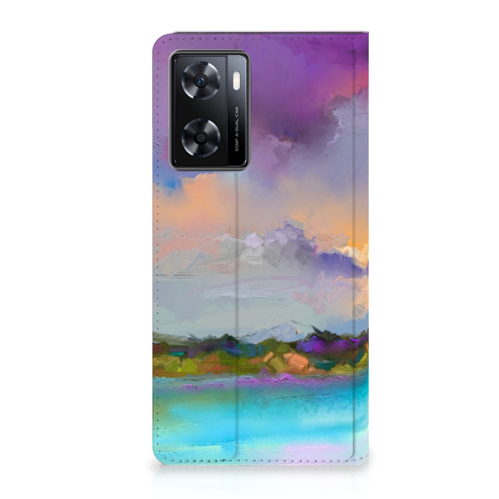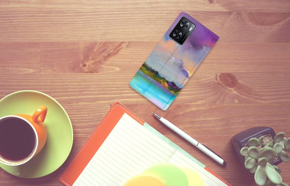 Het mooie ontwerp op dit hoesje zou je zo aan de muur willen hangen. Dit abstracte ‘schilderij’ van een bootje op een meer valt op vanwege de prachtige tinten blauw en paars. Een prachtig hoesje voor de liefhebber van kunst, boten en landschappen. Met een Bookcase is je OPPO A57 | A57s | A77 4G goed beschermd. Dit populaire smartphonehoesje heeft één vakje voor een pasje of briefgeld en is aan alle zijden bedrukt. Met de standcase zet je je telefoon gemakkelijk neer, zodat je je handen vrij hebt als je bijvoorbeeld een video wilt kijken. De binnenkant van de standcase is van grijs PU-leer. Dat is fijn, omdat je daardoor niet snel vlekken ziet op je hoesje.