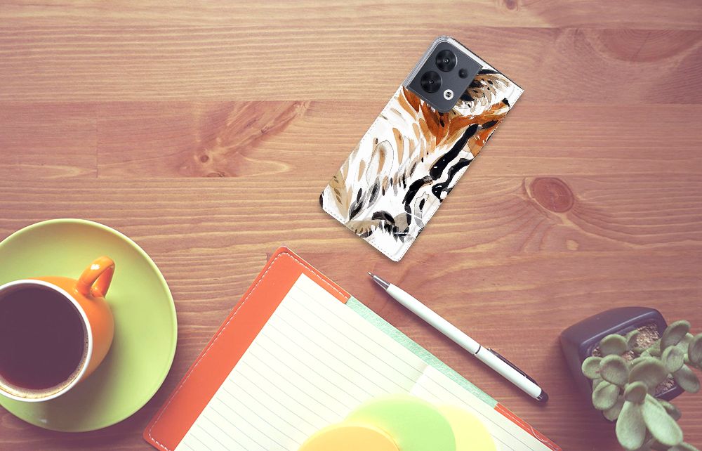 Omdat we tijgers zo bijzonder vinden, hebben we besloten deze voor zeer lage kosten voor jou op een OPPO Reno8 Bookcase te zetten. Dit kunnen we goedkoop doen omdat we het drukwerk in eigen beheer doen. De tijger staat geschilderd op de stand case tegen een grijs met wit geblokte achtergrond. De Watercolor Tiger kunnen we bedrukken op verschillende soorten hoesjes, zoals deze stand cases. Het hoesje met geschilderde tijger tegen grijs met witte achtergrond is van PU-leer (buitenzijde) en TPU (binnenzijde) en beschikt een houder voor bijvoorbeeld je bankpas. Verder is de stand case met geschilderde tijger voorzien van een magnetische sluiting aan de binnenzijde. Jij zorgt voor de perfecte bescherming van je smartphone met dit stand hoesje met geschilderde tijger tegen een grijs met witte achtergrond.