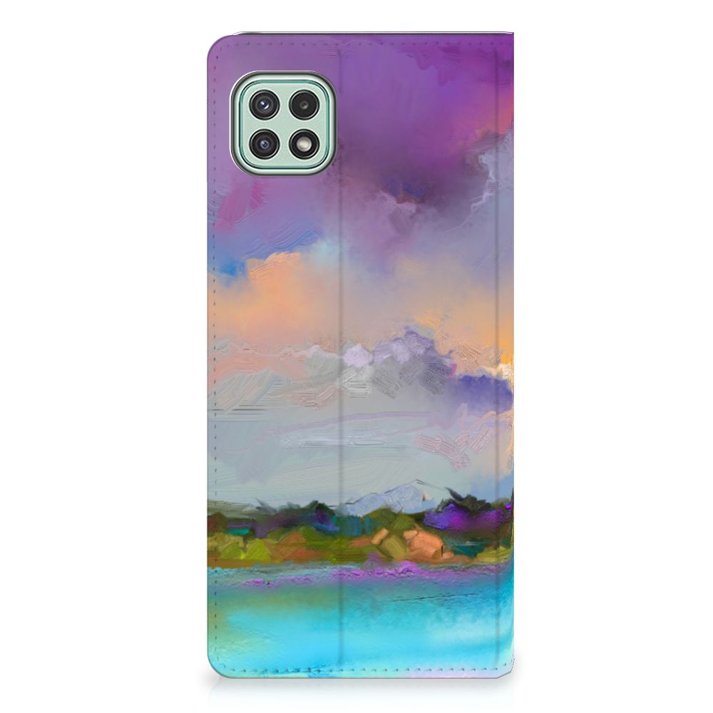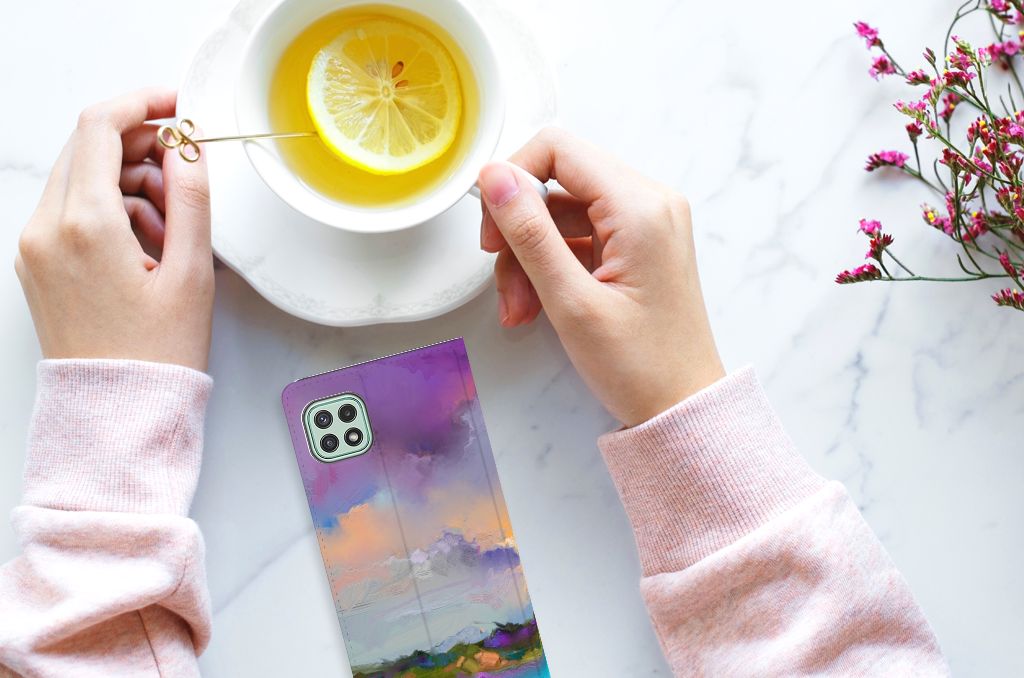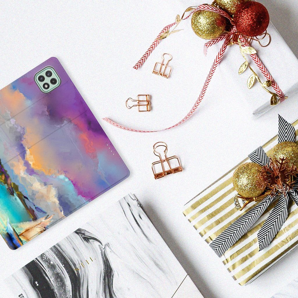 Het mooie ontwerp op dit hoesje zou je zo aan de muur willen hangen. Dit abstracte ‘schilderij’ van een bootje op een meer valt op vanwege de prachtige tinten blauw en paars. Een prachtig hoesje voor de liefhebber van kunst, boten en landschappen. Met een Bookcase is je Samsung Galaxy A22 5G goed beschermd. Dit populaire smartphonehoesje heeft één vakje voor een pasje of briefgeld en is aan alle zijden bedrukt. Met de standcase zet je je telefoon gemakkelijk neer, zodat je je handen vrij hebt als je bijvoorbeeld een video wilt kijken. De binnenkant van de standcase is van grijs PU-leer. Dat is fijn, omdat je daardoor niet snel vlekken ziet op je hoesje.
