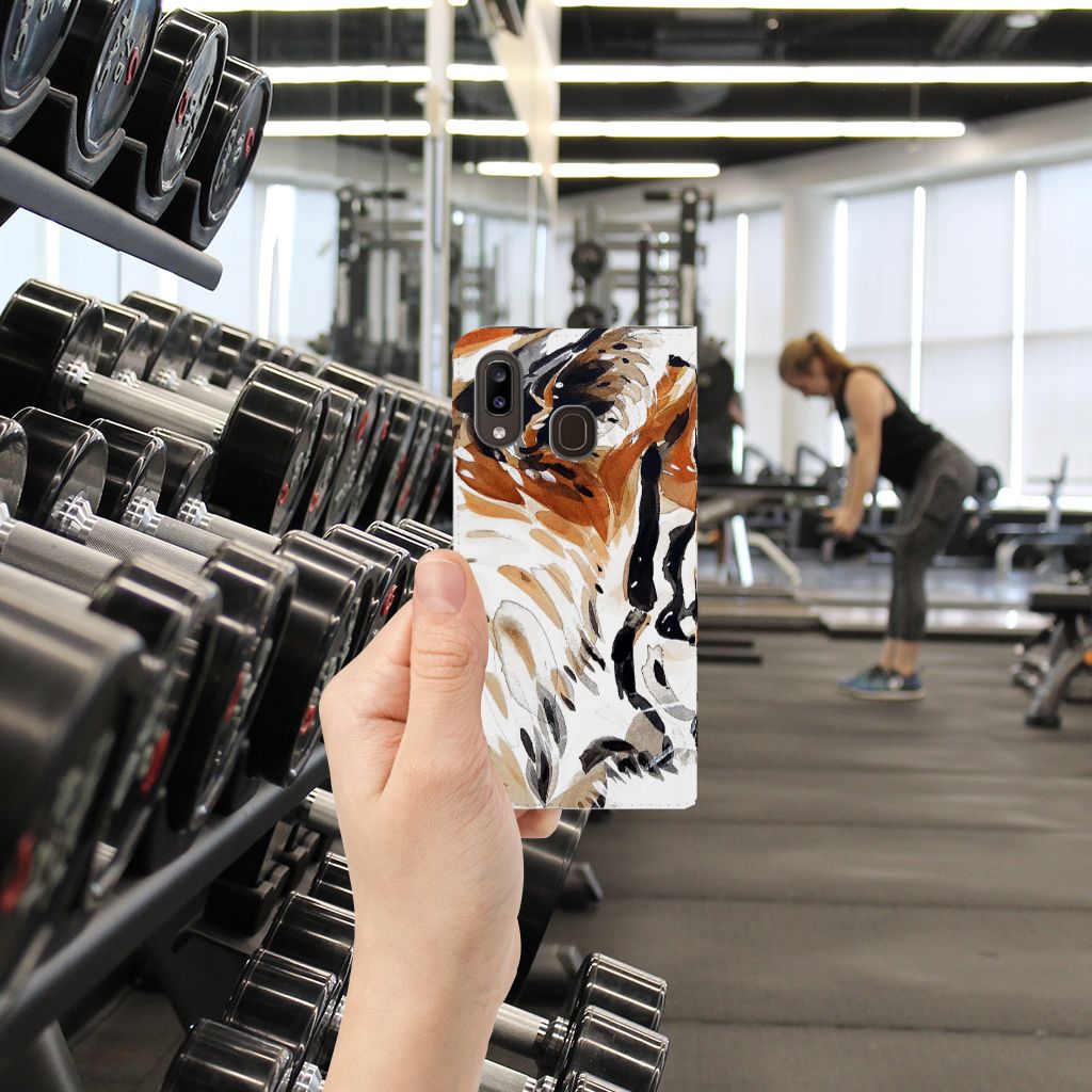 Omdat we tijgers zo bijzonder vinden, hebben we besloten deze voor zeer lage kosten voor jou op een Samsung Galaxy A30 Bookcase te zetten. Dit kunnen we goedkoop doen omdat we het drukwerk in eigen beheer doen. De tijger staat geschilderd op de stand case tegen een grijs met wit geblokte achtergrond. De Watercolor Tiger kunnen we bedrukken op verschillende soorten hoesjes, zoals deze stand cases. Het hoesje met geschilderde tijger tegen grijs met witte achtergrond is van PU-leer (buitenzijde) en TPU (binnenzijde) en beschikt een houder voor bijvoorbeeld je bankpas. Verder is de stand case met geschilderde tijger voorzien van een magnetische sluiting aan de binnenzijde. Jij zorgt voor de perfecte bescherming van je smartphone met dit stand hoesje met geschilderde tijger tegen een grijs met witte achtergrond.