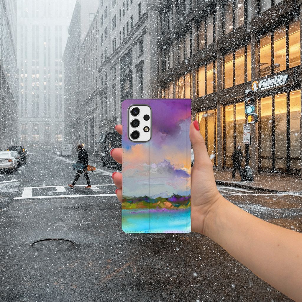 Het mooie ontwerp op dit hoesje zou je zo aan de muur willen hangen. Dit abstracte ‘schilderij’ van een bootje op een meer valt op vanwege de prachtige tinten blauw en paars. Een prachtig hoesje voor de liefhebber van kunst, boten en landschappen. Met een Bookcase is je Samsung Galaxy A53 goed beschermd. Dit populaire smartphonehoesje heeft één vakje voor een pasje of briefgeld en is aan alle zijden bedrukt. Met de standcase zet je je telefoon gemakkelijk neer, zodat je je handen vrij hebt als je bijvoorbeeld een video wilt kijken. De binnenkant van de standcase is van grijs PU-leer. Dat is fijn, omdat je daardoor niet snel vlekken ziet op je hoesje.